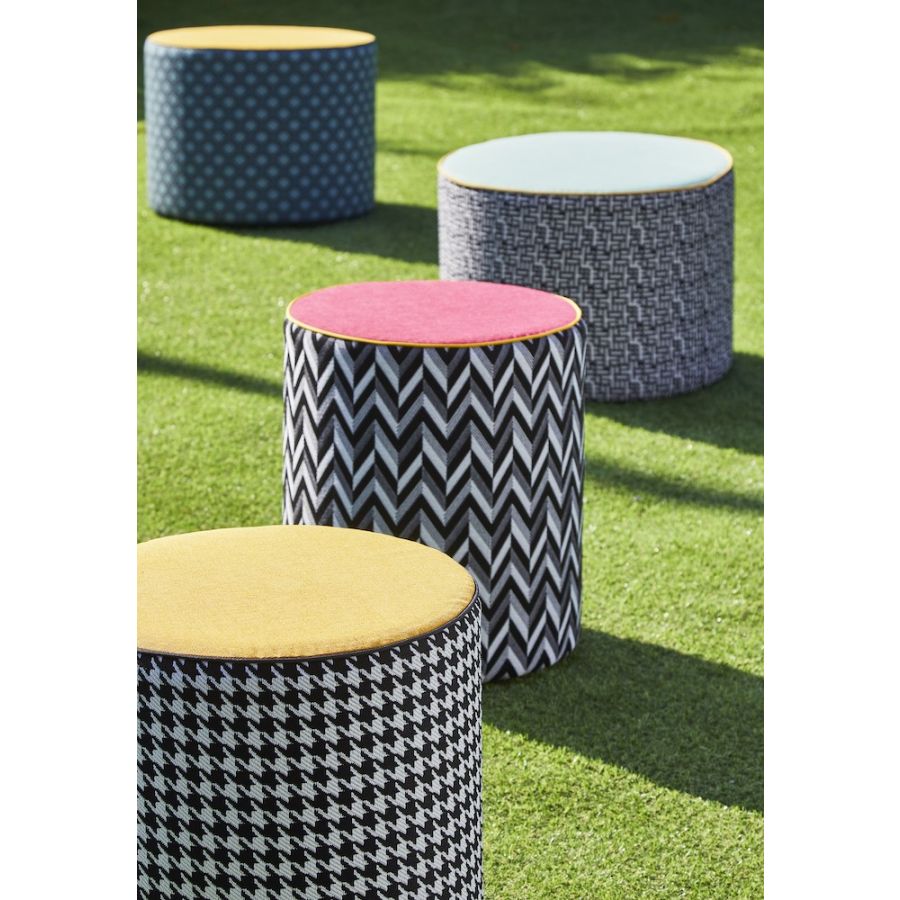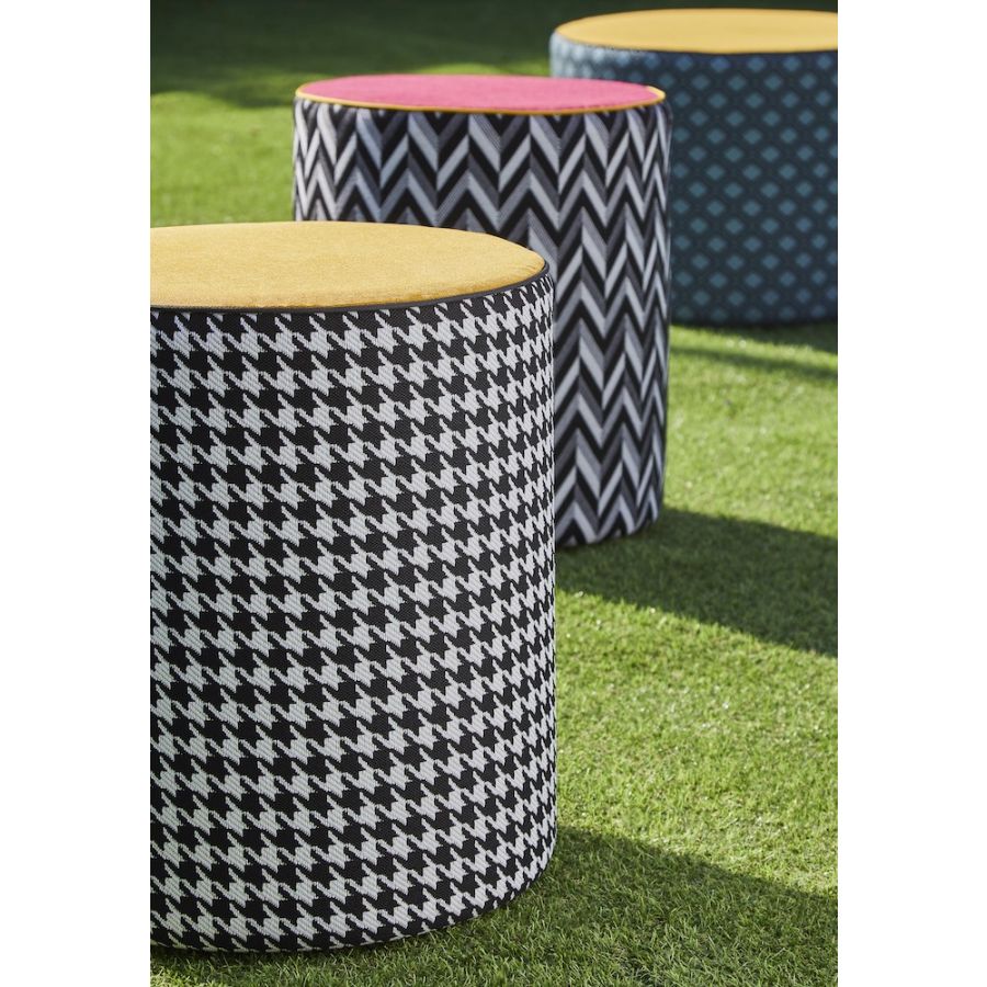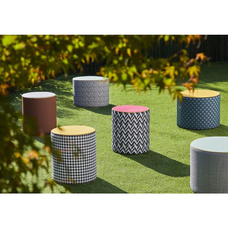 The exclusive textures of Calypso and Babu fabrics become the unique covers of CALYBABU: the outdoor ottoman collection, conceived by Contardi, is presented with five combinations of geometric motifs in different colours.