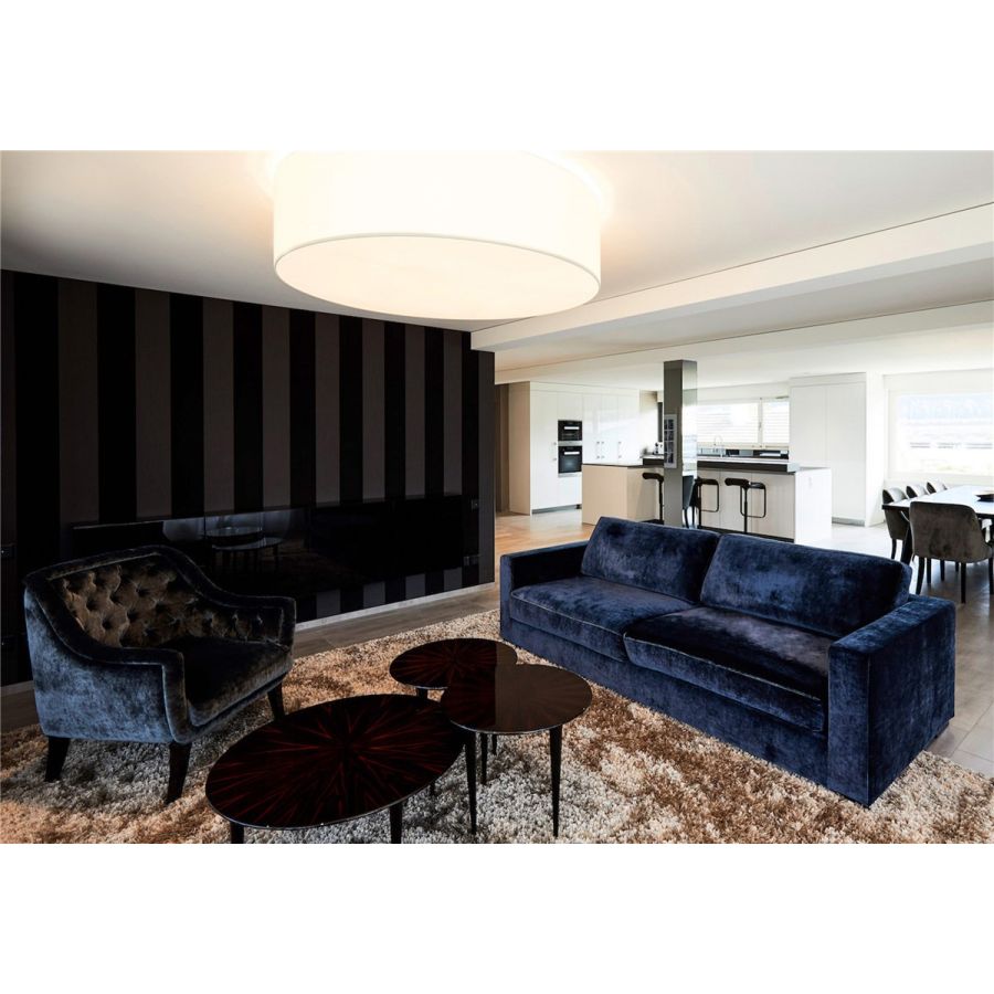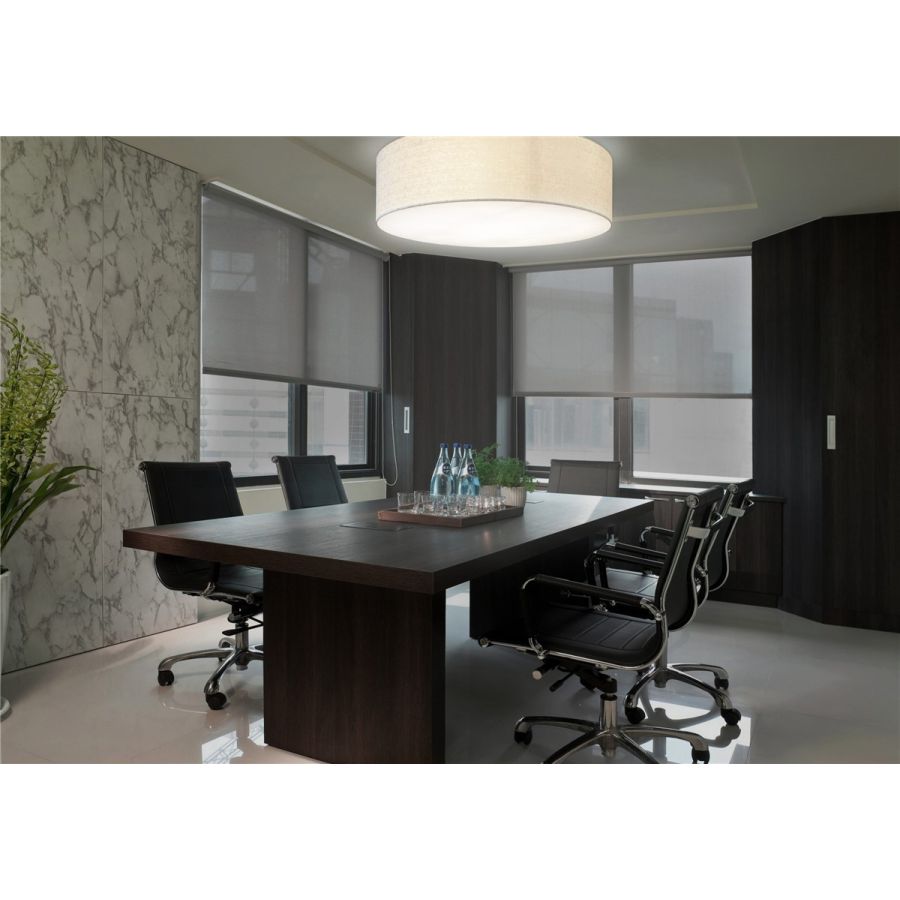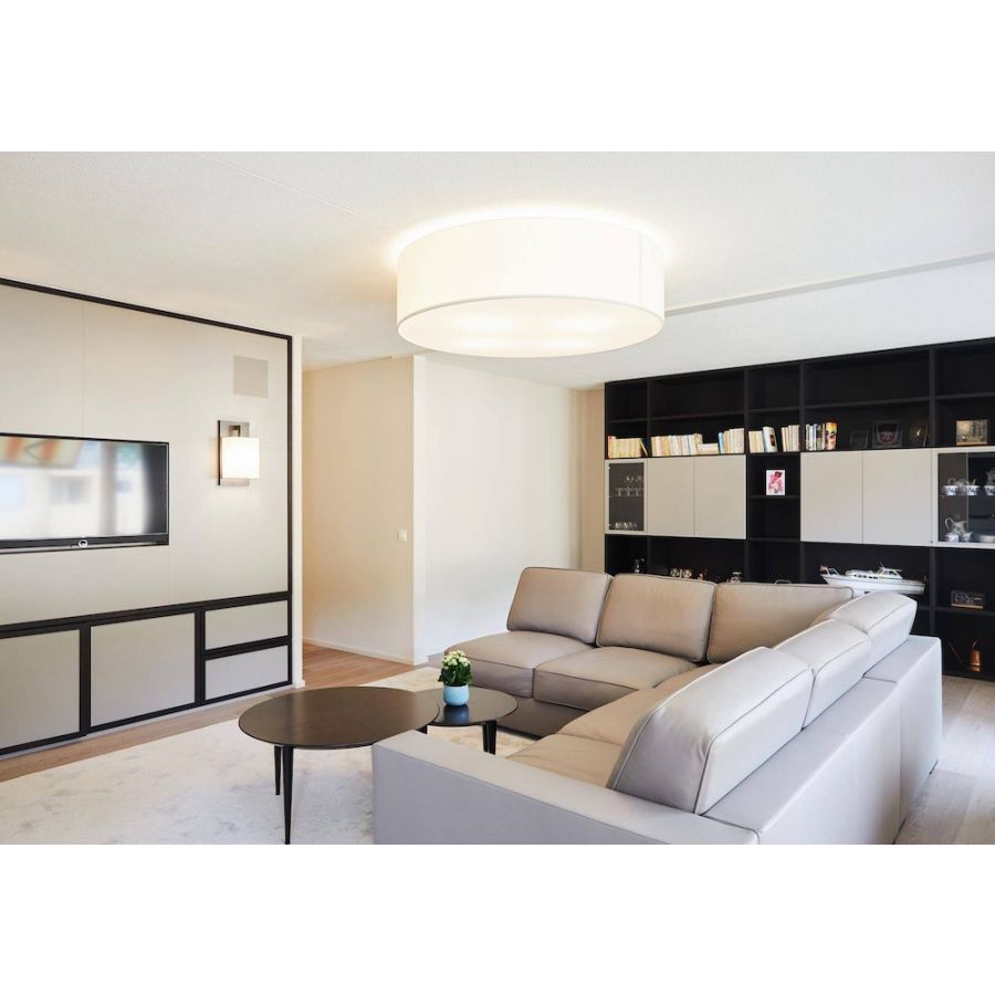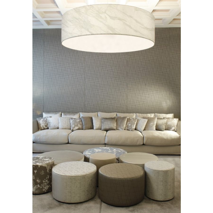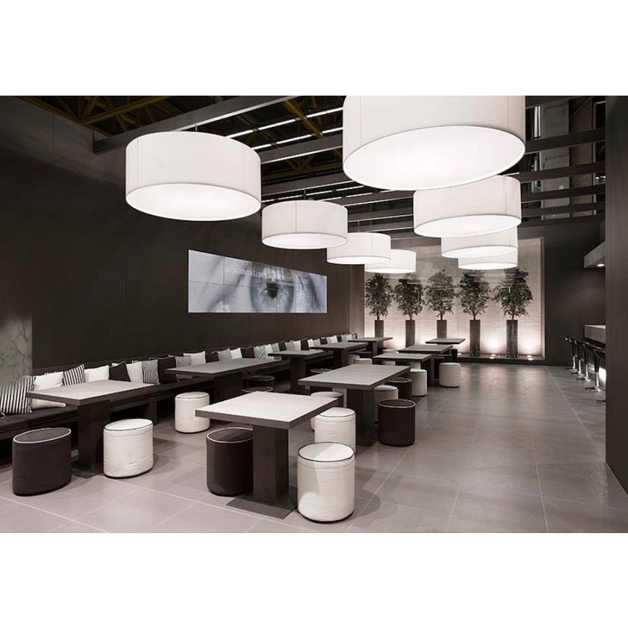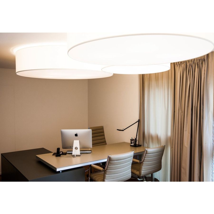 A simple but complete product that allows you to customise the fabric lampshade with trimmings of different colours. All sizes are available with two different light sources: the version with E27 bulbs mounted vertically on the support beams to ensure uniform illumination without the formation of shadows and the version with customized LED plate, very compact, designed for use in commercial spaces, such as offices and retail shops. The latter offers the possibility - unlike the traditional version - to significantly reduce the height of the lampshade.