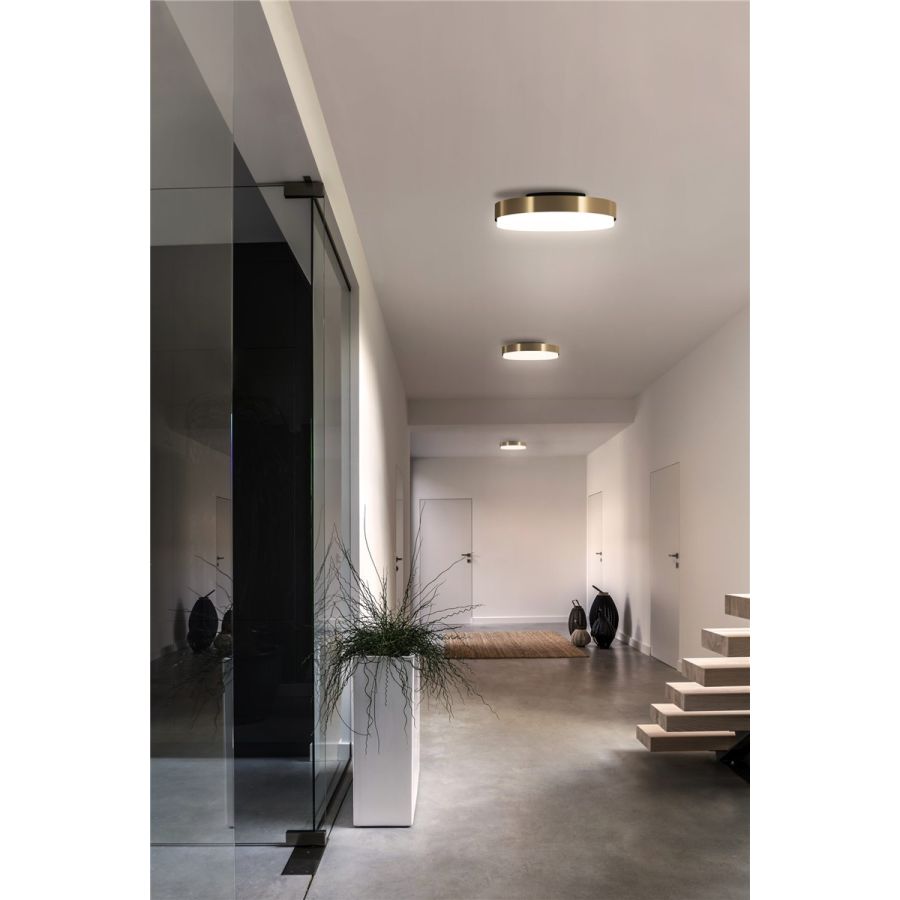 This product range boasts a minimalist look, with a decisive and dynamic graphic line where light, shape and decoration frame the space in an evocative and contemporary way. Two metal discs, which can be white or black, enclose the illuminating source in an interlocking game. The white opal diffuser in the middle is framed by a semi-polished brass band that gives a touch of luxury to the design. The particular shape of the structure, which in the wall version has a 120°rotating arm, allows the light to spread uniformly over the entire surface – this makes the product ideal for any location and use, in both residential and high-end hospitality contexts.