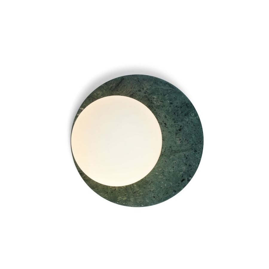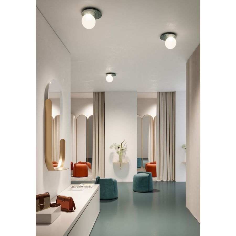 The base in the table version, and the wall and ceiling supports, are made of green Guatemala or white Calacatta marble; the diffuser is a charming white opal sphere that, thanks to its pure essence, spreads the light evenly. Emma’s simple appeal and sinuous shapes adapt to different types of environments, be they residential, retail or hospitality.
