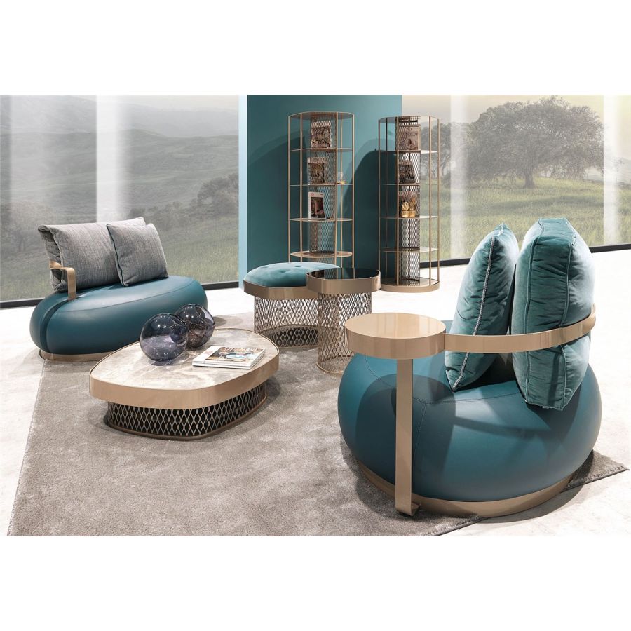 A new family of coffee tables and bookcase elements available in various sizes and heights to create unique and multifaceted compositions. The perforated structure symbol of the collection is reminiscent of a bracelet, which supports tops from the most diverse materials: marble, mirror, wood and even padded cushions, to transform the support into a seat. Asparagus is perfect presented in multiform compositions with marble top, mirror and padded cushion.