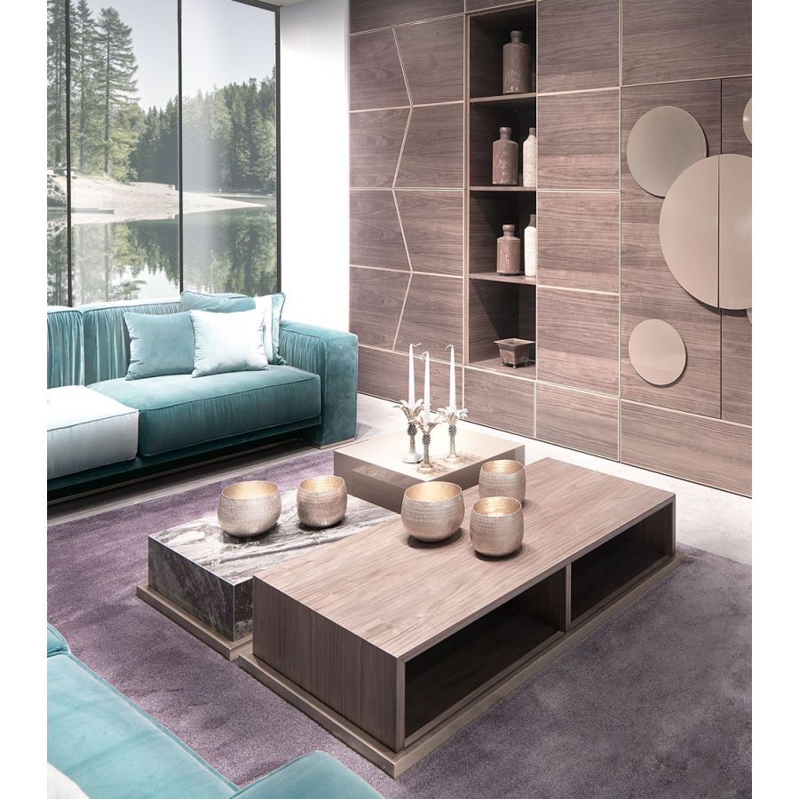 Brick is the ensemble of monolithic coffee tables with a prominent plinth that surrounds the composition creating a single visual element. The projetting base surrounding each block is in metal and joins the composition or helps each element to live as a separate one. Choose the different finishings from the wide sample set.