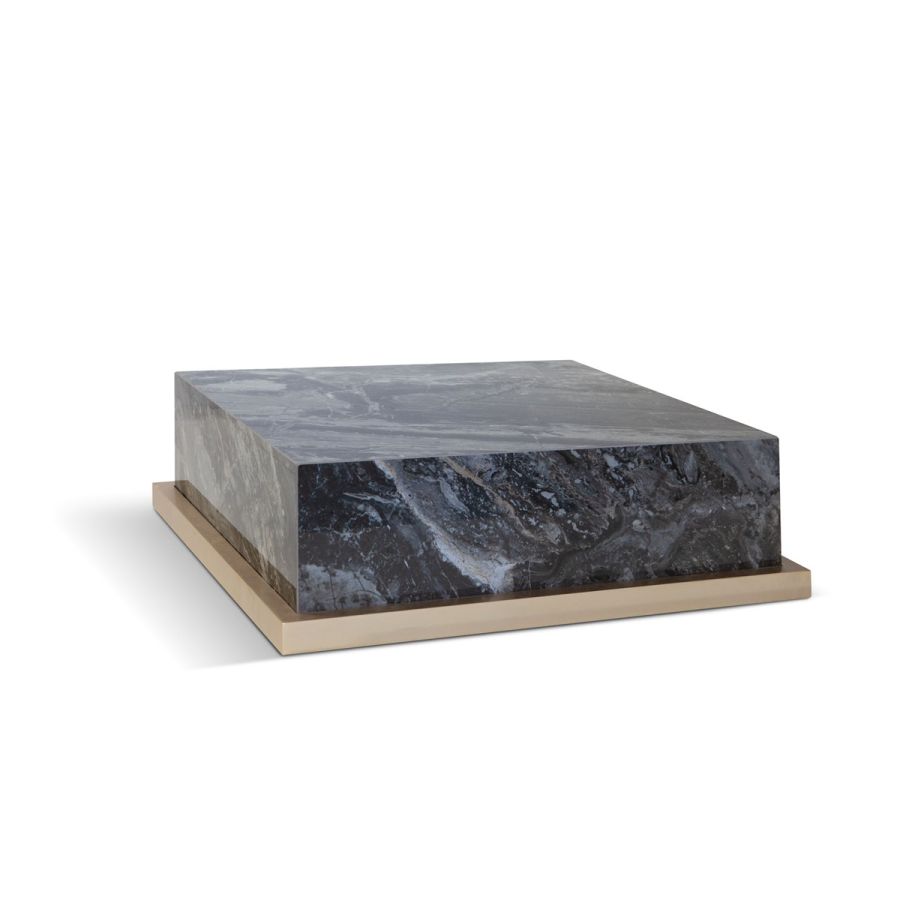 Brick is the ensemble of monolithic coffee tables with a prominent plinth that surrounds the composition creating a single visual element. The projetting base surrounding each block is in metal and joins the composition or helps each element to live as a separate one. Choose the different finishings from the wide sample set.