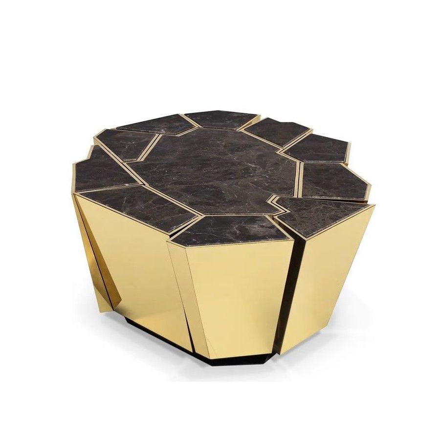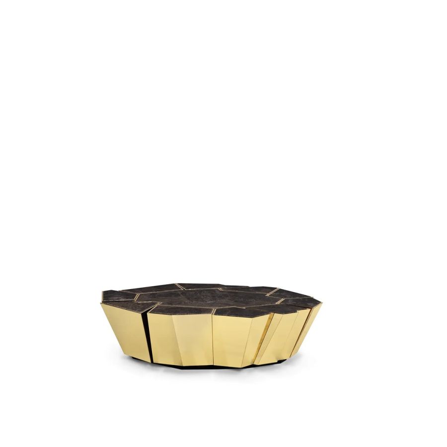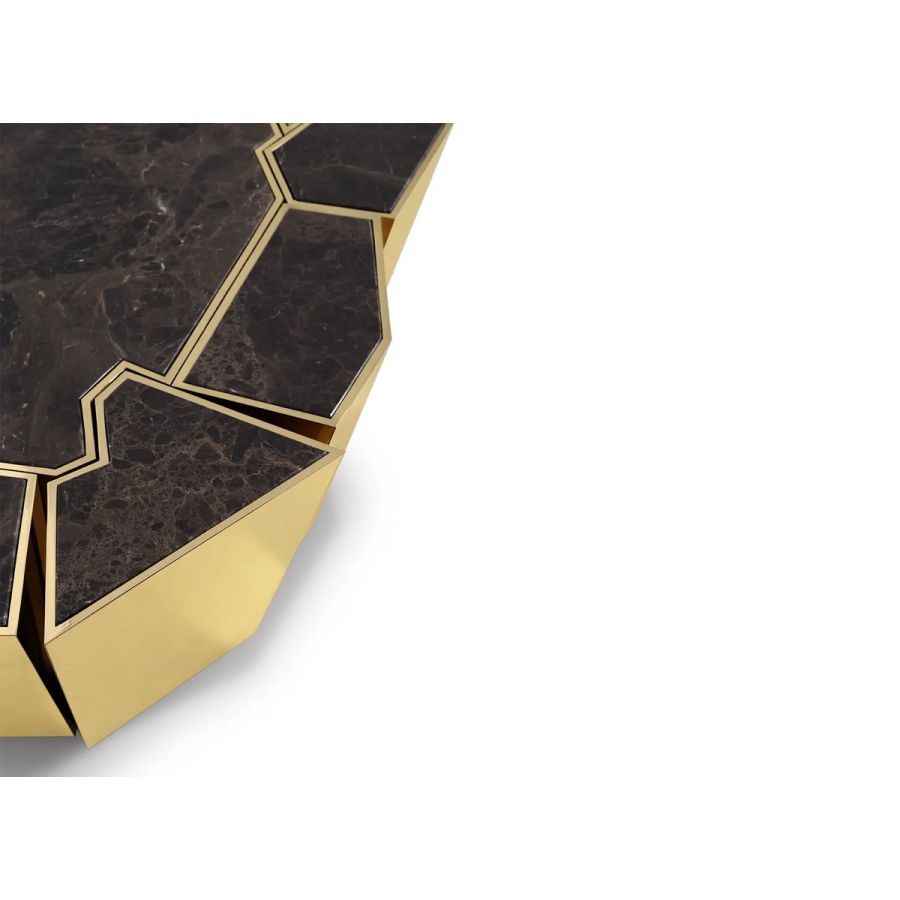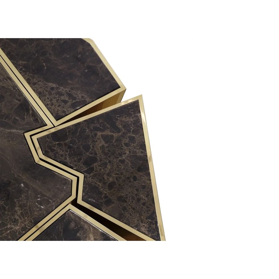 Following the same inspirational lines as the Crackle collection, this modern center table stands out for the complexity of the manual work on the brass and the technique used to apply the walnut root veneer. Whether placed in a hotel lobby or as a centerpiece in a cozy living room, this versatile table exudes elegance and functionality.