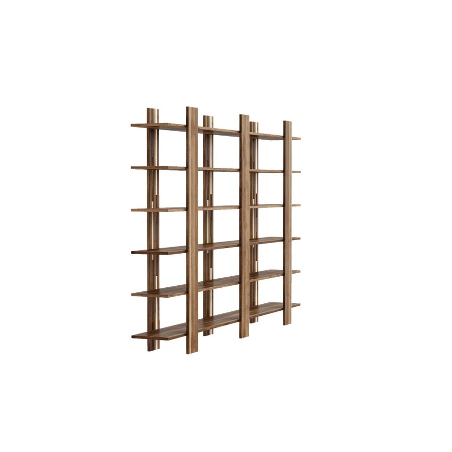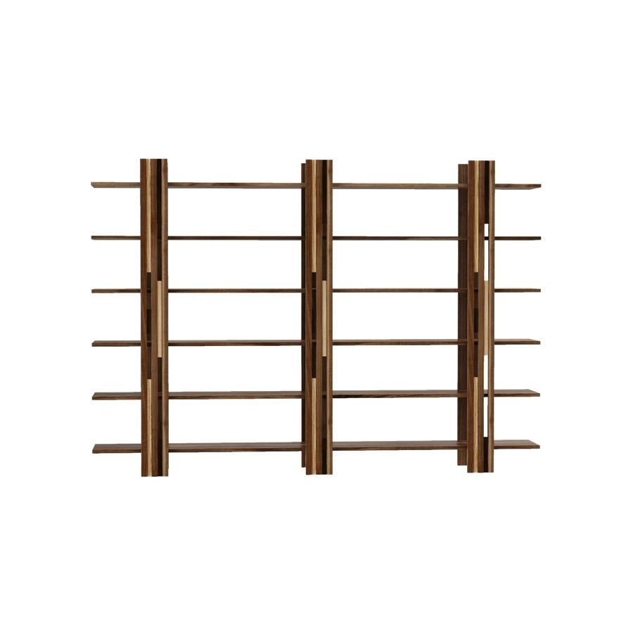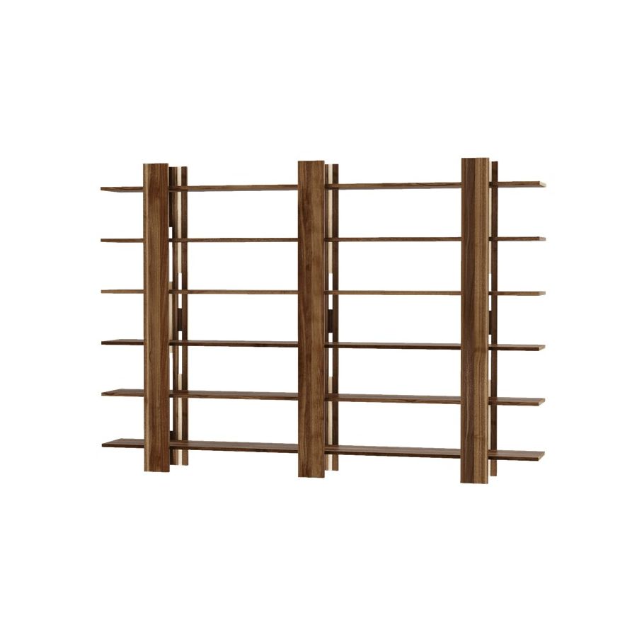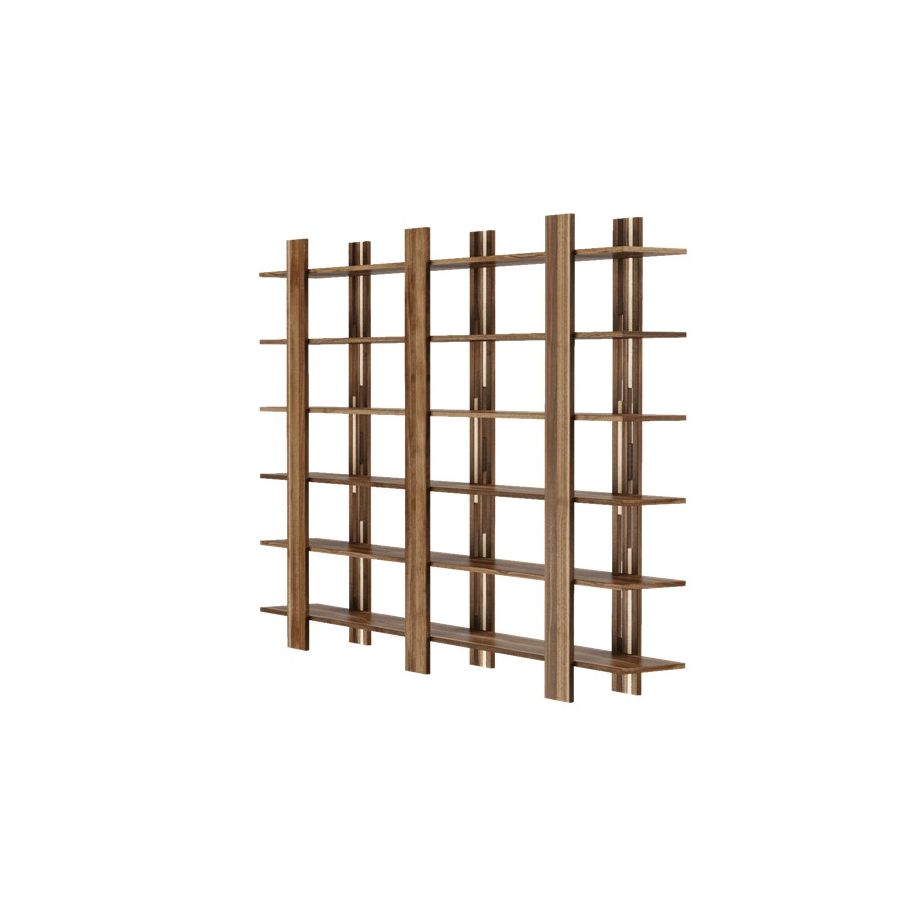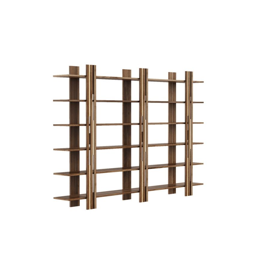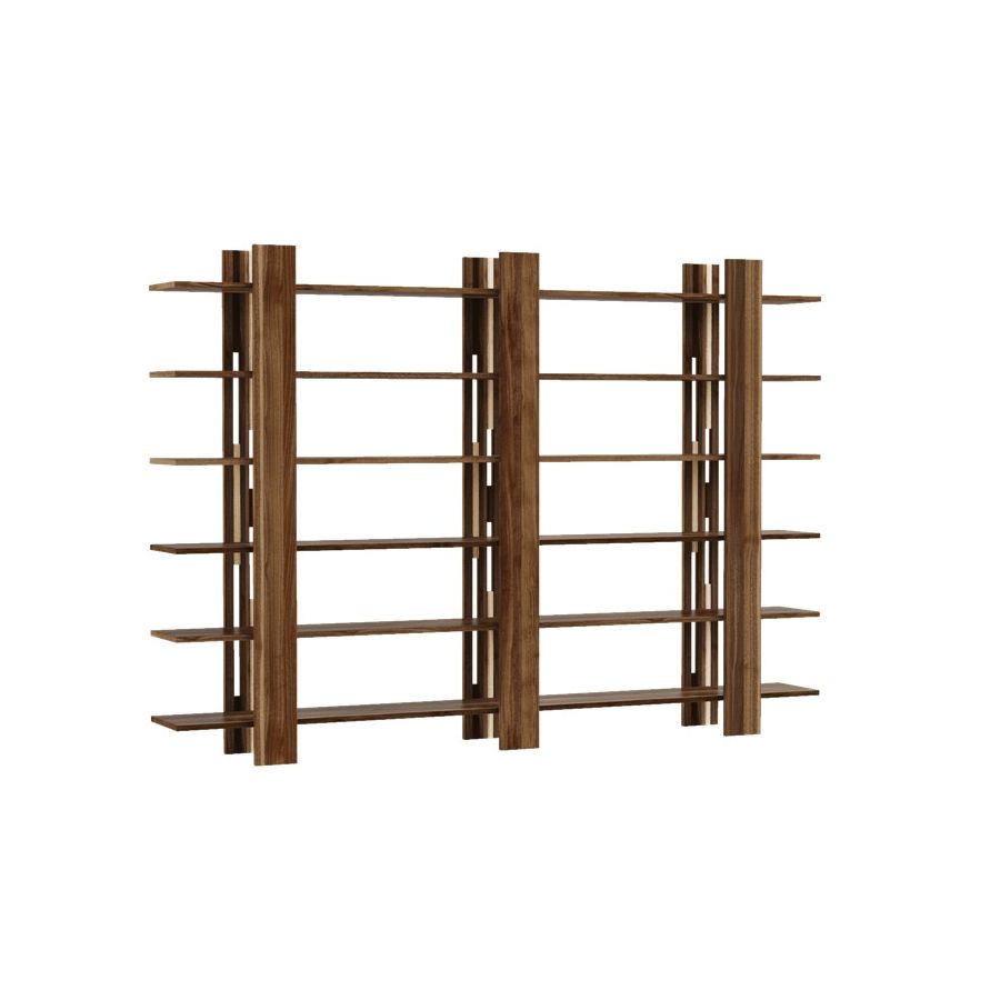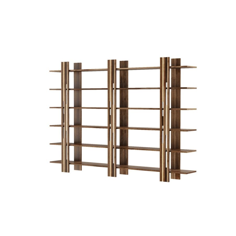 The Gravità solid wood bookcase is a simple and linear composition that conveys a feeling of suspension. It uses magnetic vertical elements to hide the joints of the support surfaces.