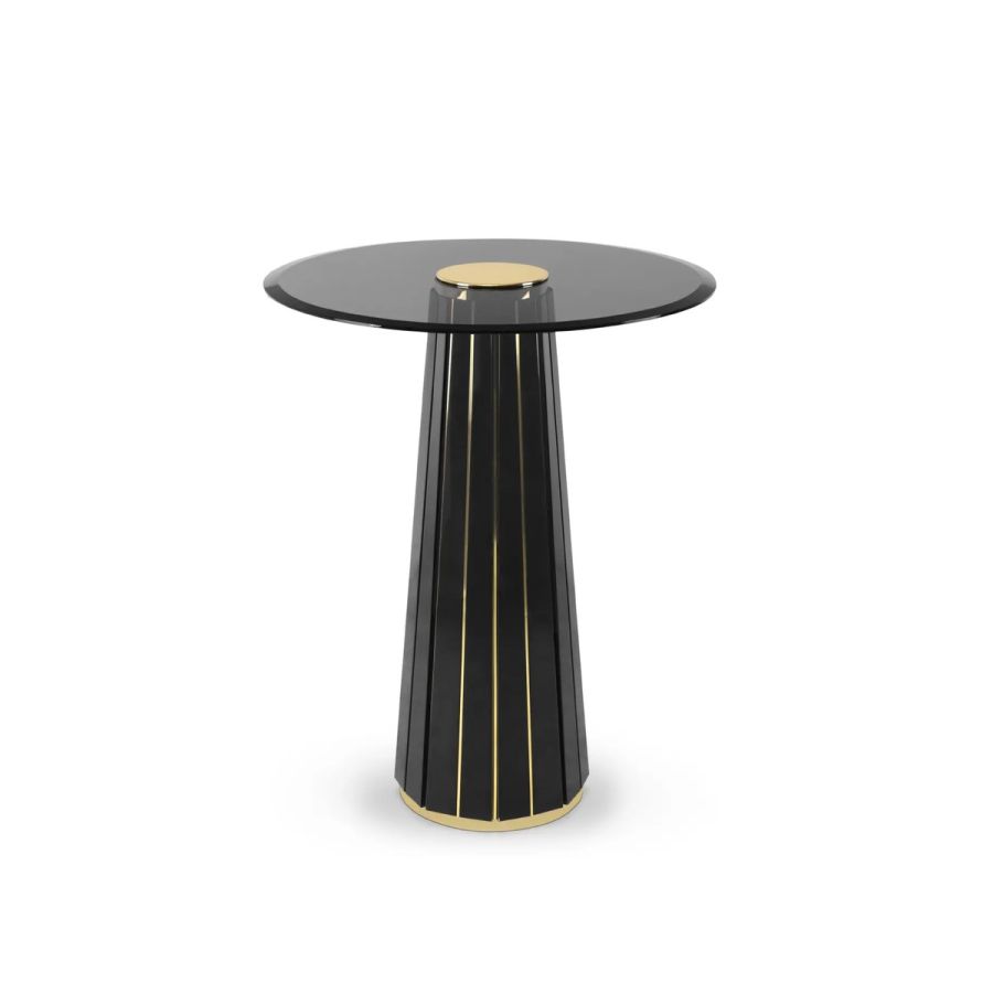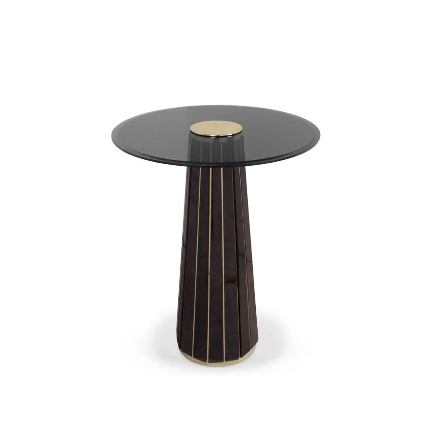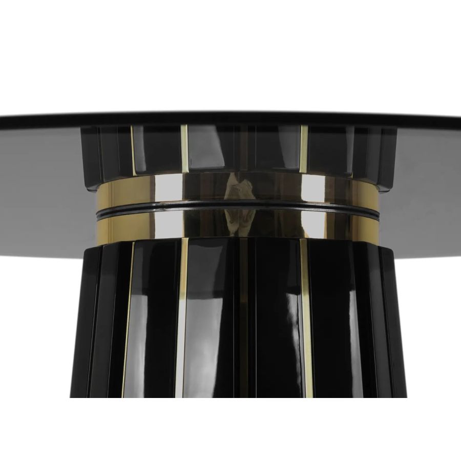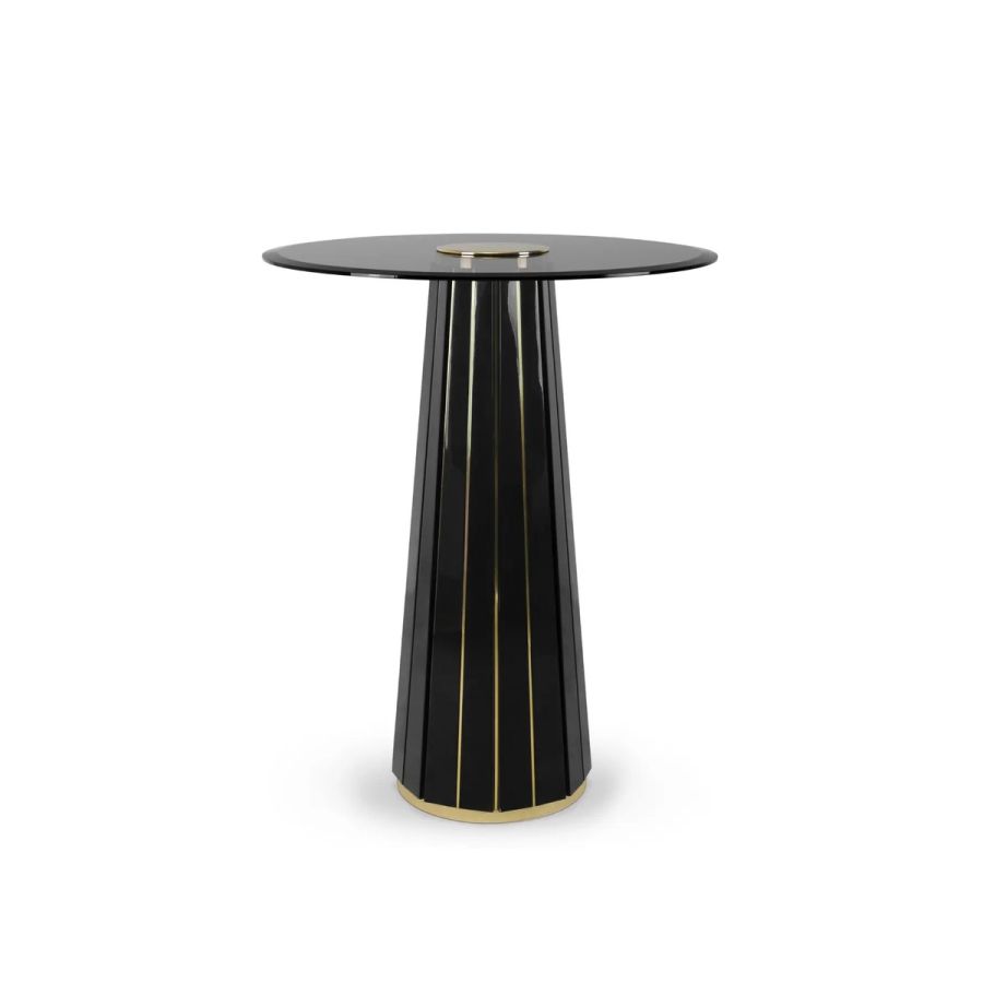 The Darian Bar Table draws inspiration from the strength of a shield and embodies luxury in its design, making it an ideal choice for high-end projects such as bars, lobbies, or cocktail lounges. With a wooden structure adorned with polished brass bars and a round top made of smoked glass, this table exudes elegance and sophistication.