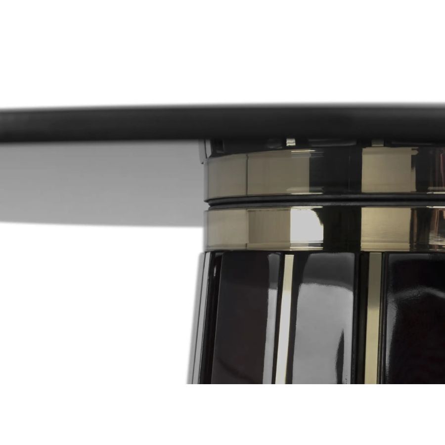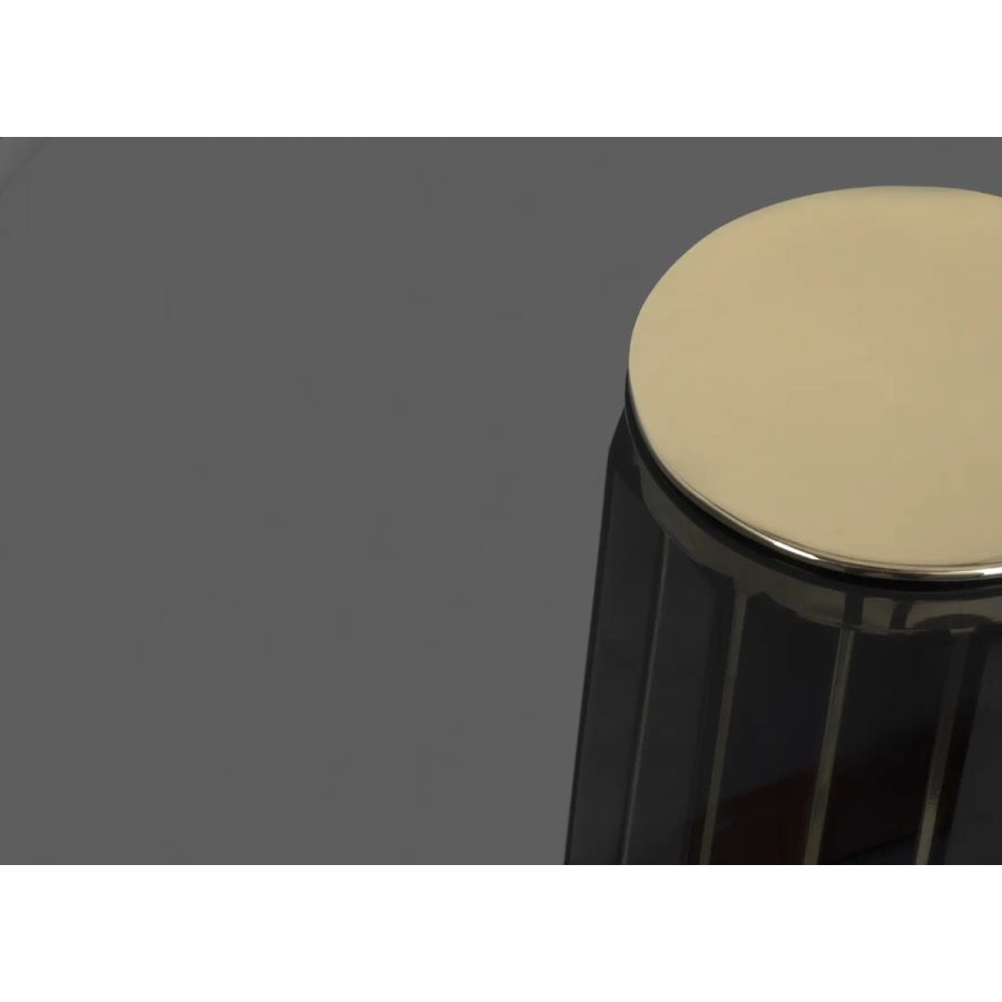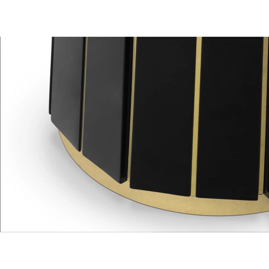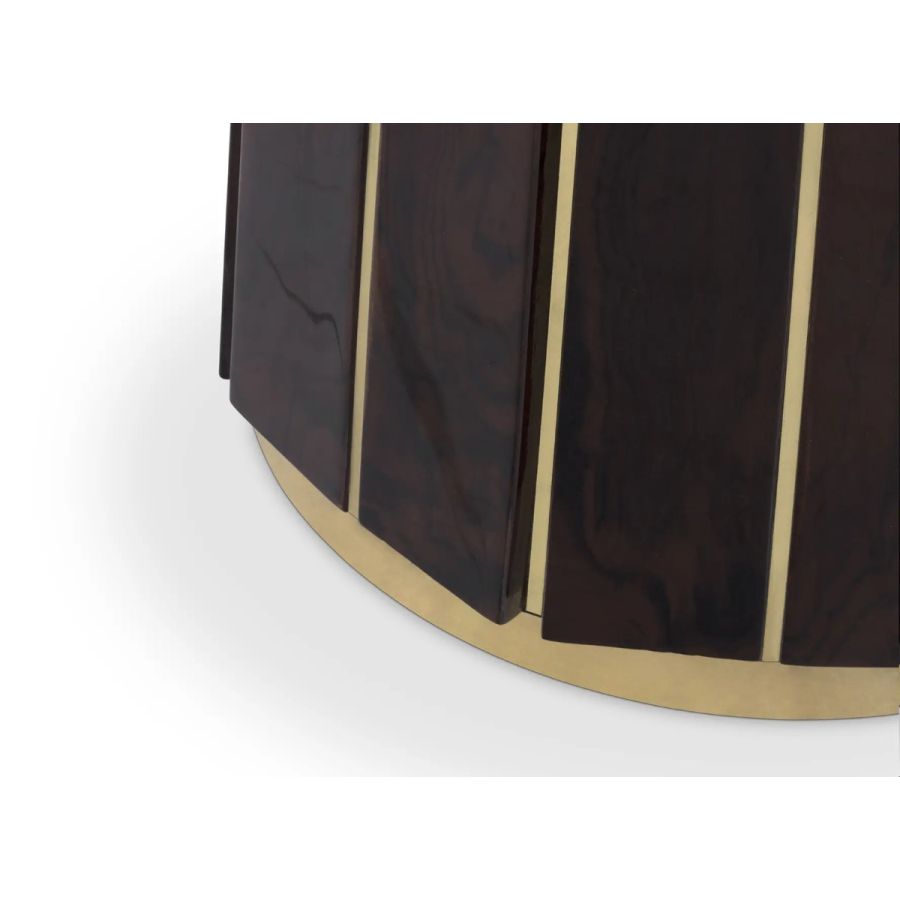 The Darian Bar Table draws inspiration from the strength of a shield and embodies luxury in its design, making it an ideal choice for high-end projects such as bars, lobbies, or cocktail lounges. With a wooden structure adorned with polished brass bars and a round top made of smoked glass, this table exudes elegance and sophistication.
