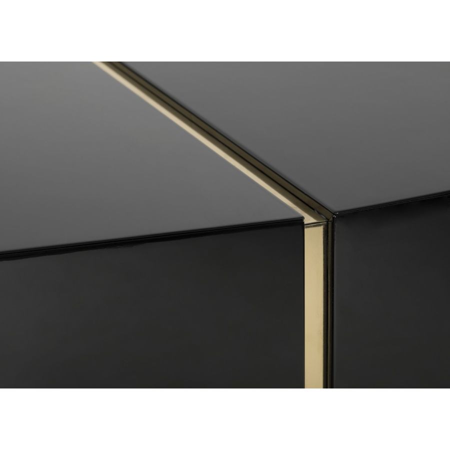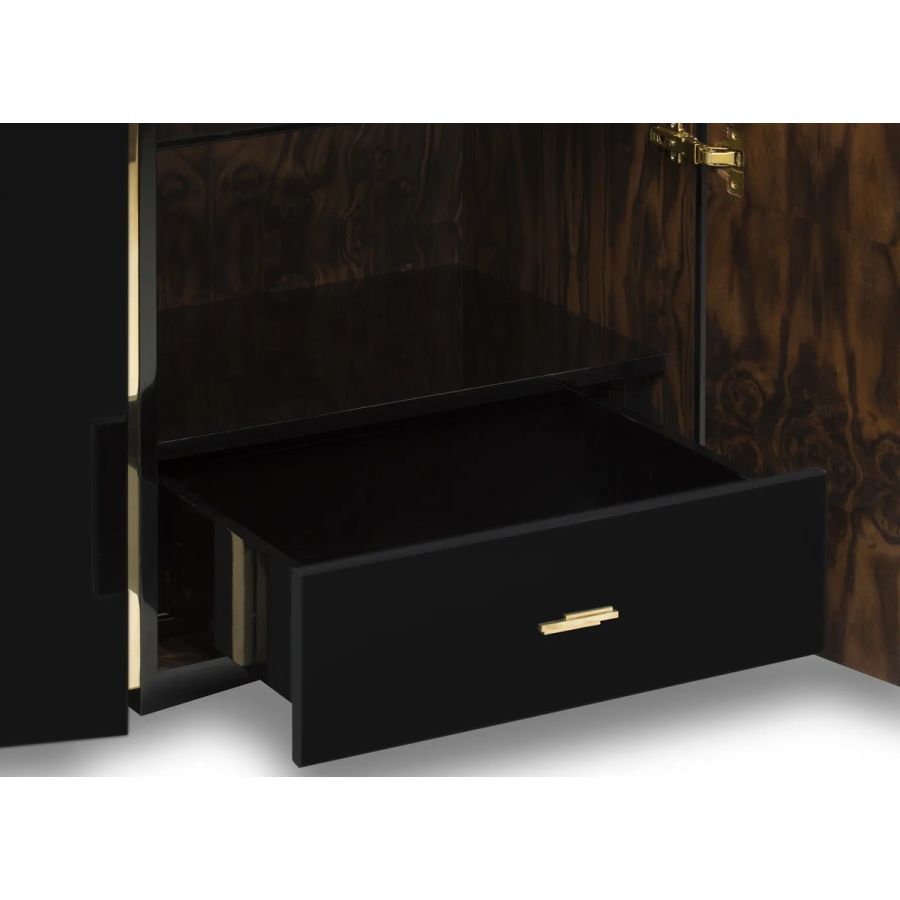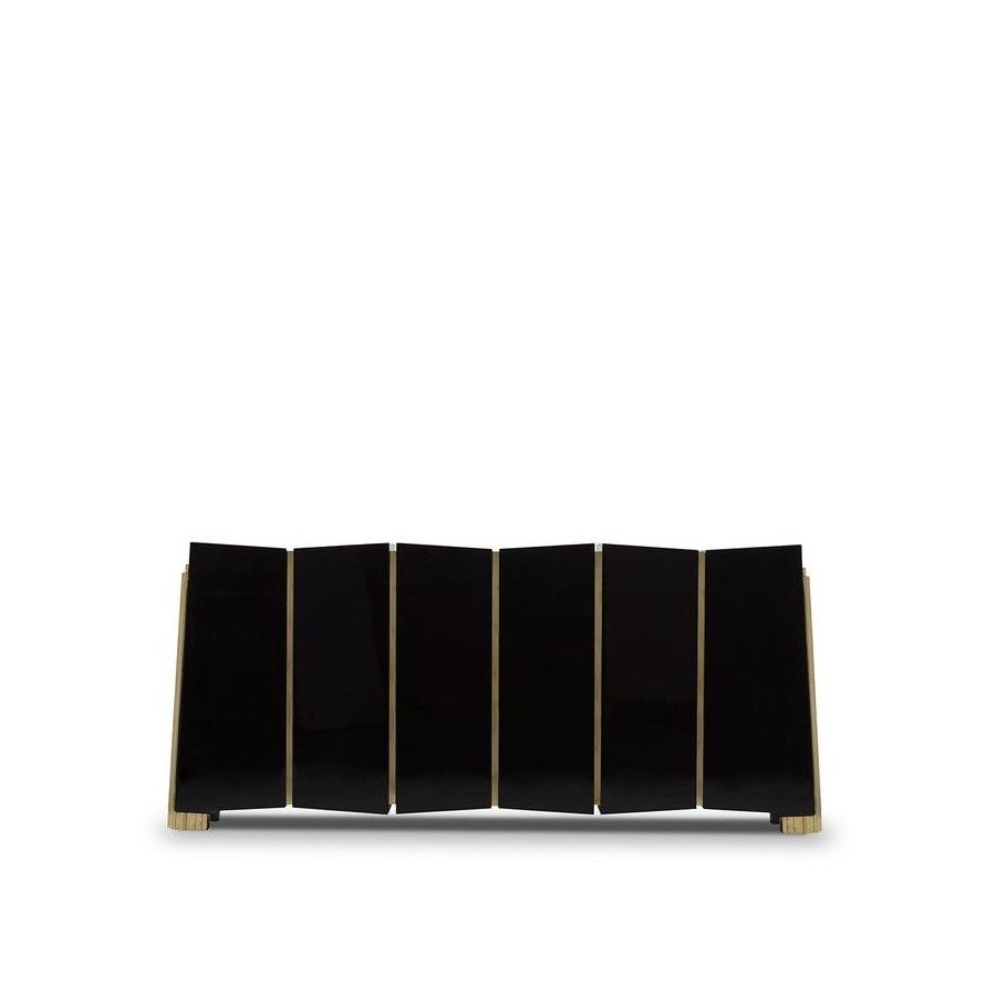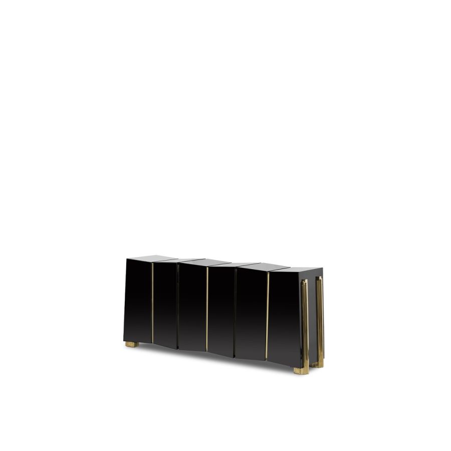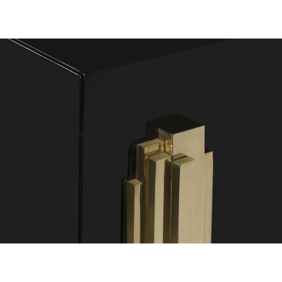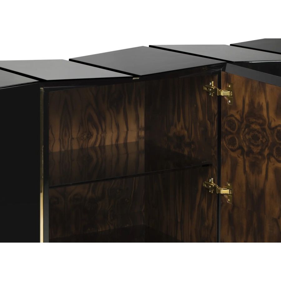 The Darian Sideboard draws inspiration from the power of the shield and sphere of protection, as well as the dynamic nature of its irregular shape. With precise knowledge of production techniques and materials, each with different specialties, from metalwork to wood carving, this piece showcases exceptional craftsmanship. It features a cluster of polished brass asymmetrical bars enveloping a wood structure in black lacquer, resulting in a captivating blend of artistry and strength.