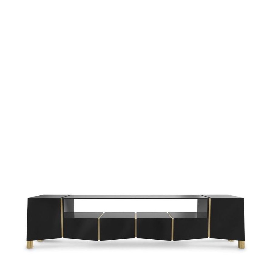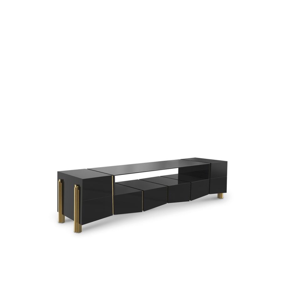 The Darian TV Cabinet was inspired by a classic line of LUXXU's furniture. It is a sumptuous piece that blends the splendor of art with a strong personality. Featuring polished brass asymmetrical bars and a wood structure in black lacquer and smoked glass, it harmoniously combines powerful design elements while maintaining a clean and sophisticated vibe for any TV room.