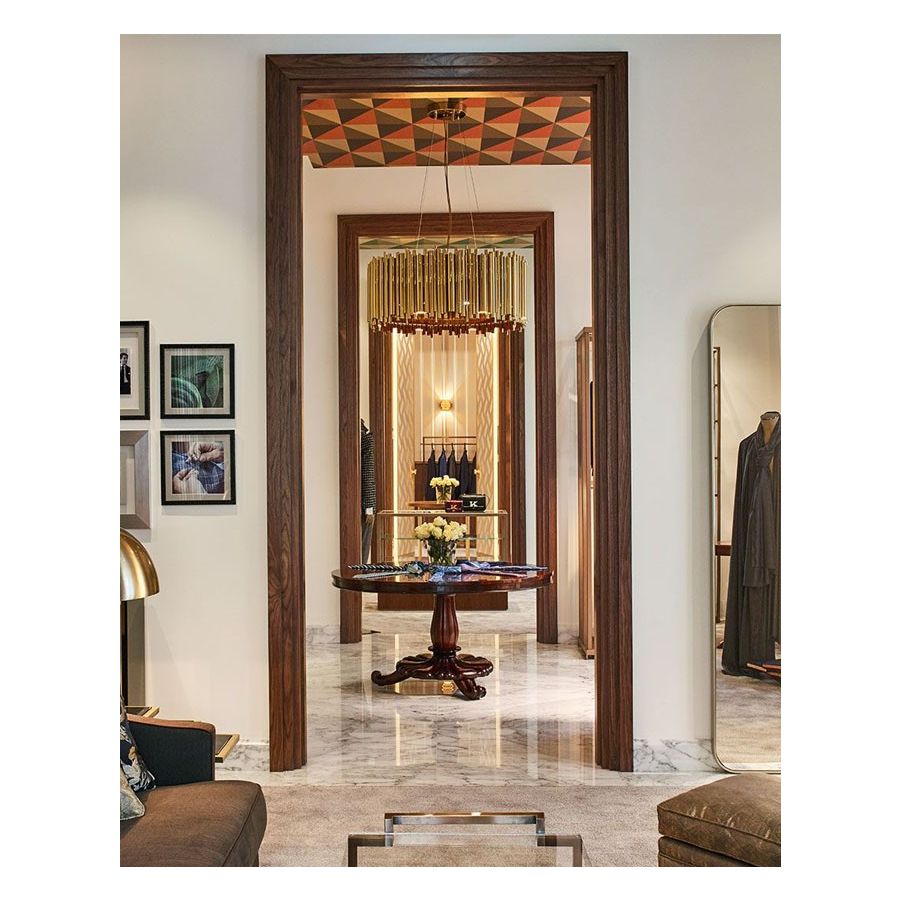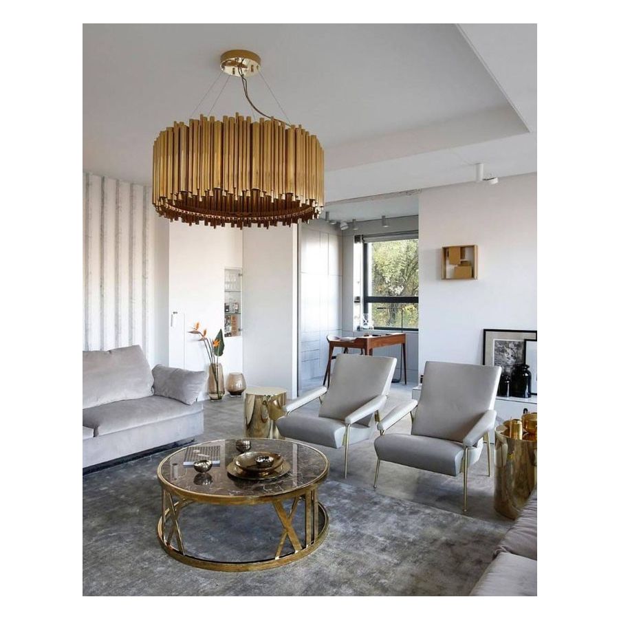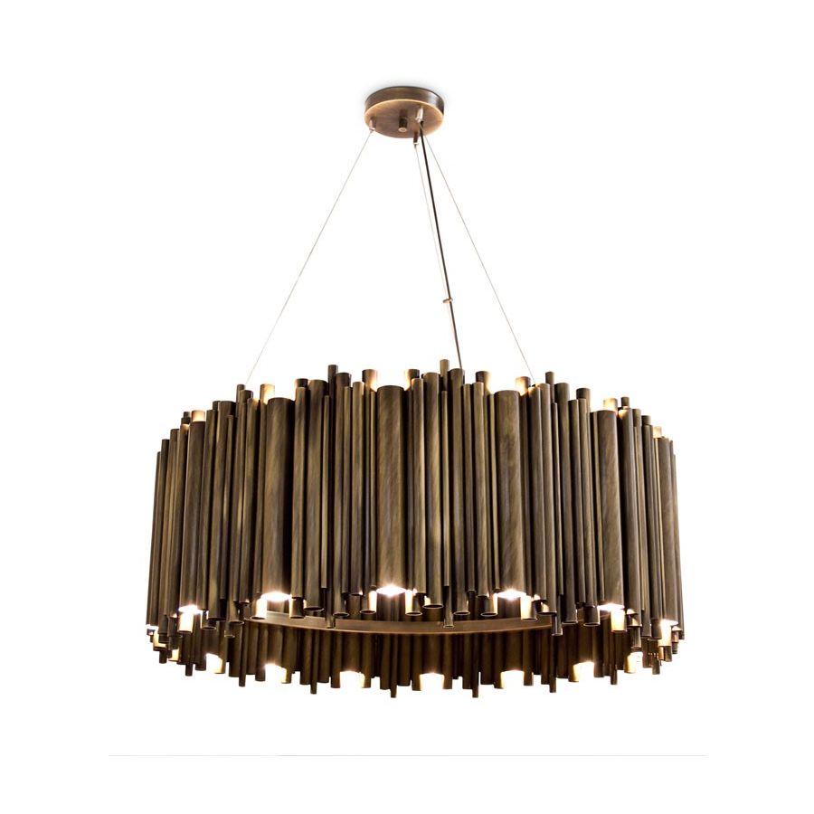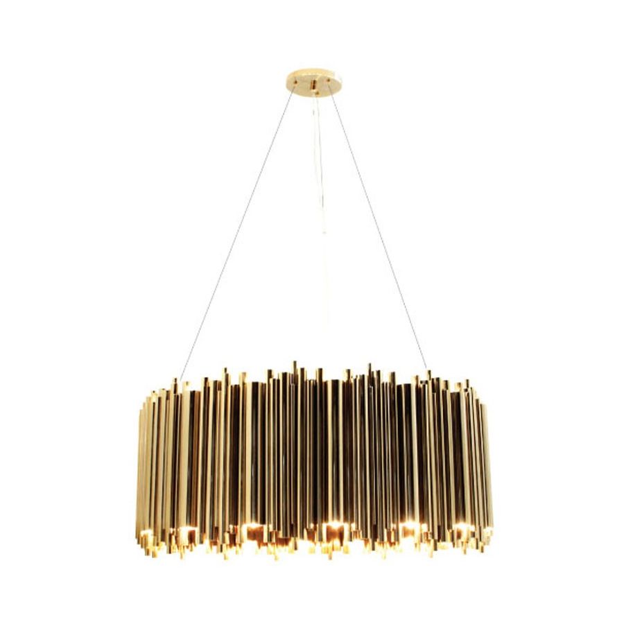 Brubeck mid-century modern chandelier is inspired by one of the foremost exponents of cool jazz: Dave Brubeck. This unique lighting design represents the sophistication and finesse of the American jazz pianist, displaying a very luxurious feeling. DelightFULL’s skilled artisans handmade this round chandelier in brass, covering it with a gold-plated finish, which can be customized in multiple other finishes. The result of this outstanding creation is a functional dining room chandelier with sculptural shapes.