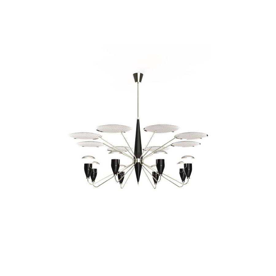Peggy modern chandelier has a 60’s feel that won’t go unnoticed. With a structure handmade in brass and with a top cover in perforated steel, this unique lamp has a nickel plated and matte white finish. The dazzling lighting design lamp shades are in matte black, making an incredible contrast with the matte white top cover, that characterizes this contemporary chandelier. With almost 18 pounds, Peggy chandelier light also offers the choice of having only 4 of the 8 diffusers lit on. Peggy is a great modern lighting solution for your living room decor and can also be used as a modern dining room chandelier.