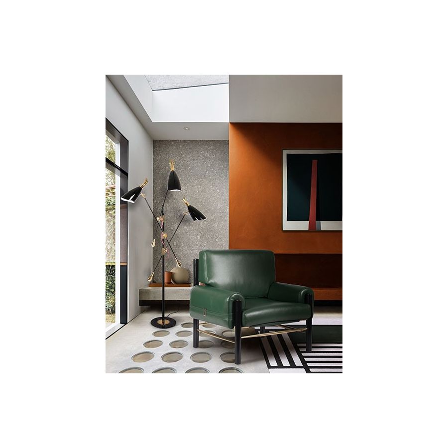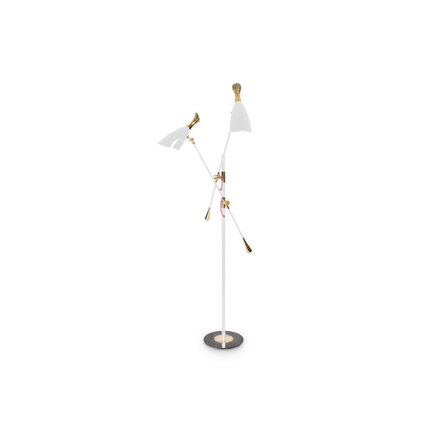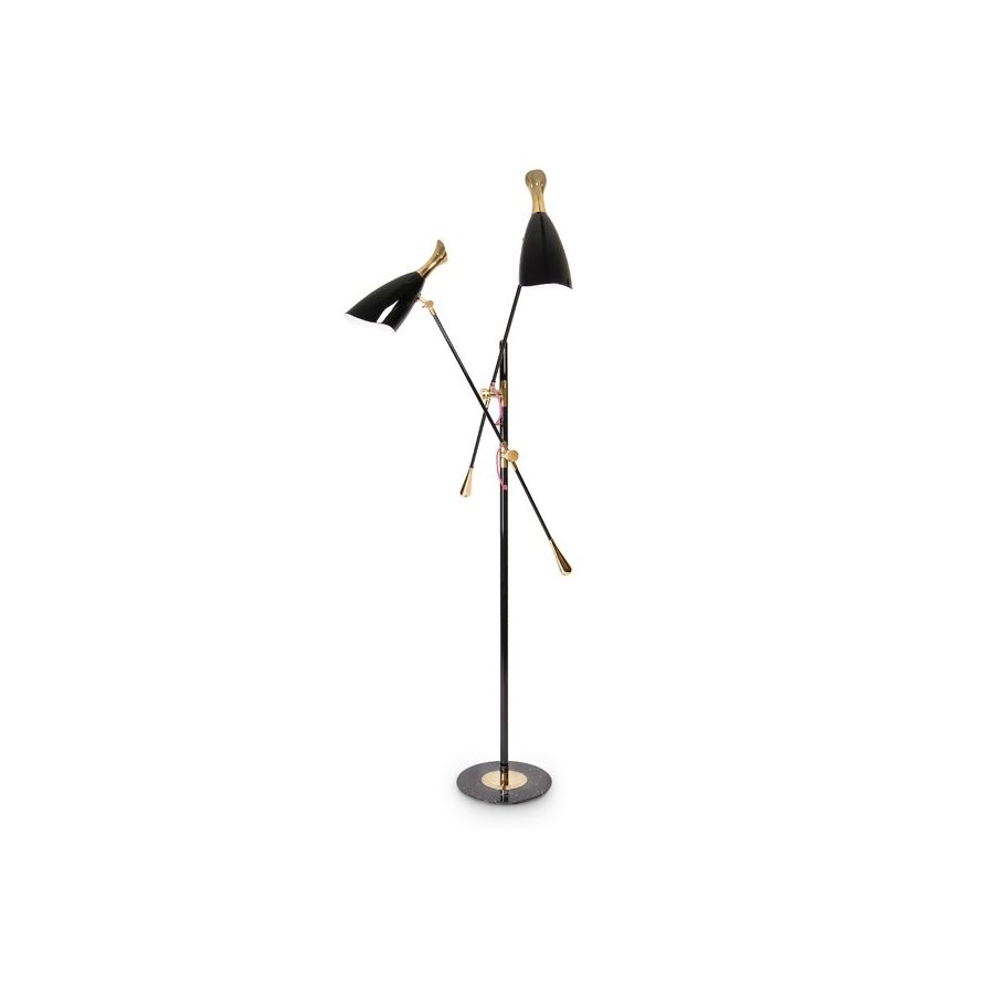 Duke Ellington has been an inspiration to the world to many artists and musicians. Therefore, DelightFULL’s designers have decided to pay a tribute to this iconic jazz musician and create Duke floor lamp. With a short silhouette and a single swing, Duke floor lamp is a retro-styled accessory for every single mid-century modern interior design. Each cone lamp shade is conducted by a brass arm and its counter-weight. The matte black shades drape on the sides to reveal a white interior and have gold plated accents at the sockets. The three-cone shades that adjust vertically and horizontally have an overall height of 63.7 inches.