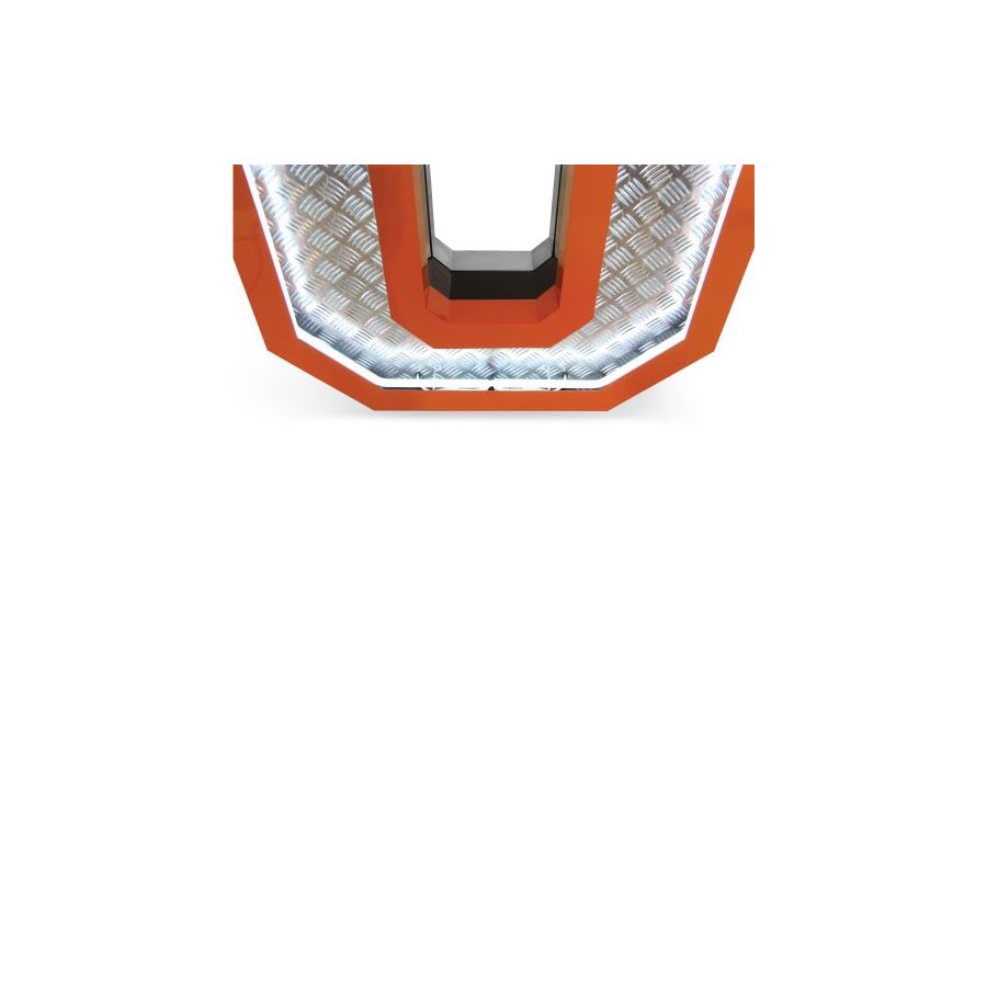 Inspired by the great 70's, the geometric lines and the exterior orange underlines that contour the aluminum fixture is a sign of the times ahead. Covered with diamond plated steel that reflects the white neon glow of the marquee lighting design is the ones to characterizes this lighting fixture. Creating a new aura in any design project, this handmade lighting design has a 1 meter in height. Versatile, you can put this lighting design on the wall or on the floor. Fitting for outdoors as well, you can customize your lighting design on demand.