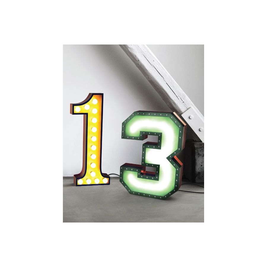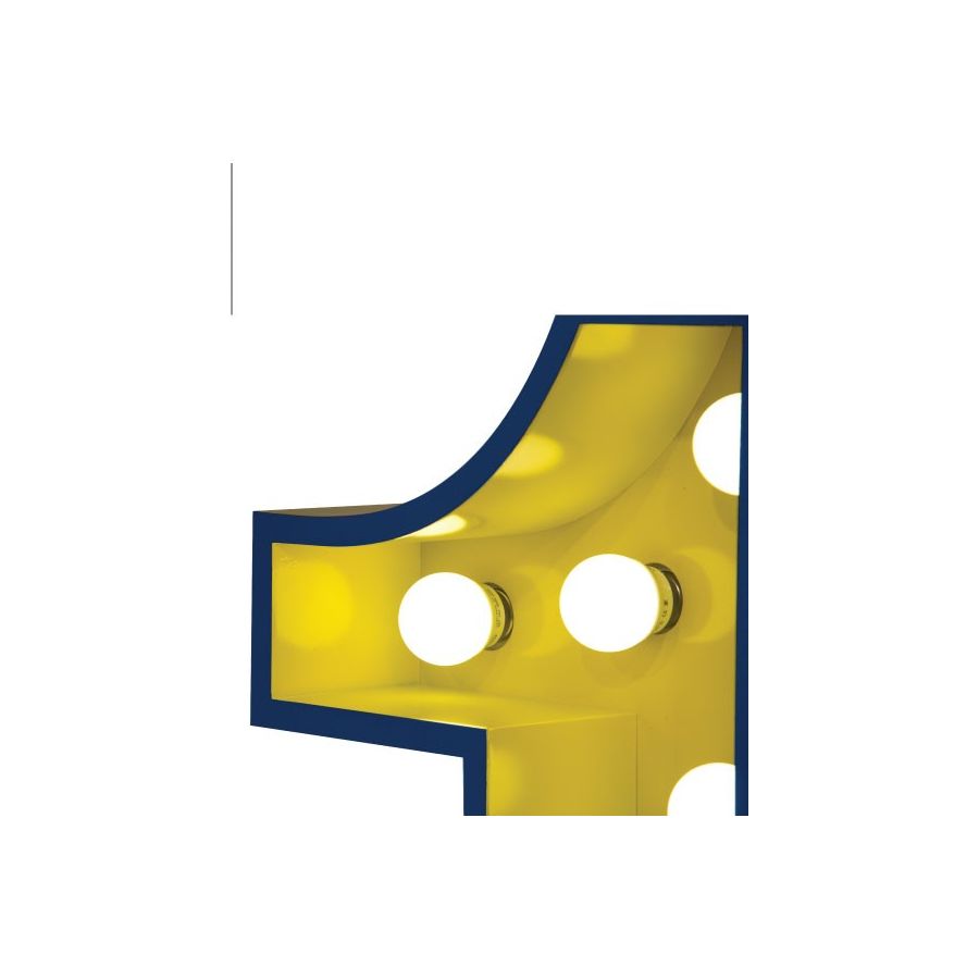 Celebrating design with friends is the motto, and while you're celebrating it isn't too bad being number 1 - that's where this marquee letter comes from. With an eclectic touch, this 15 bulbs yellow lighting design has an outline in blue that will make your design project sophisticated and original like no other. With a height of 1 meter, this marquee lighting design can be floor lamp or a wall mounted. The marquee lamp that can customizable on demand, is available on a mini version and fits perfectly into an interior design project.
