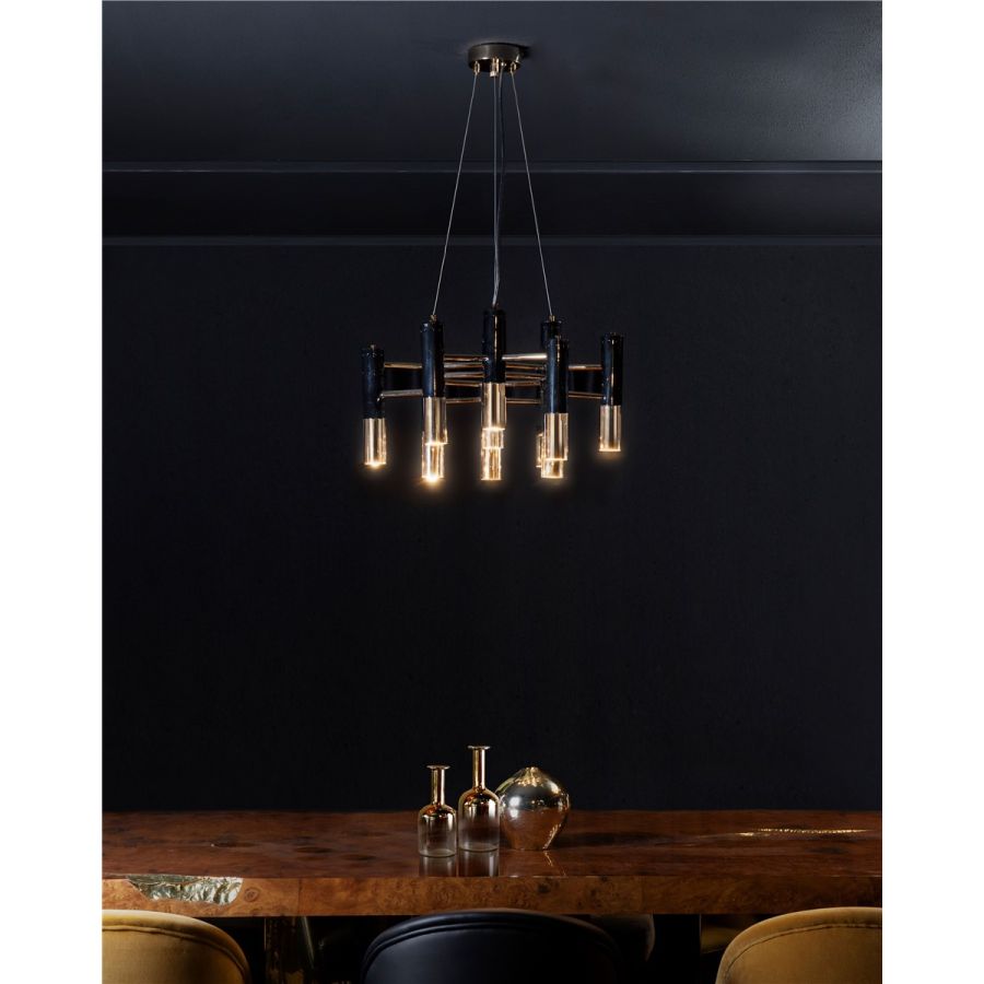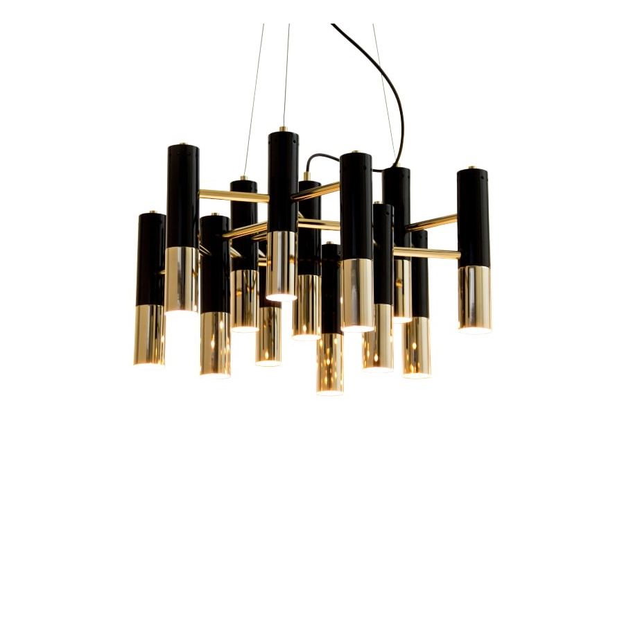 Ike suspension lamp has a distinctive but easily recognizable design, ideal for every single mid-century modern interior. With its clean lines, this dazzling lamp is handmade in brass and aluminum and features a glossy black and gold plated finish, representing a high-quality craftsmanship. It is 15 inches tall, but its steel cord can be customizable on purchase, being flexible up to 39.4 inches. Highly recommended to use with a dimmer switch to cast a smoother light, this modern brass lamp is perfect as a dining room chandelier lighting or to be used in a hotel lobby.