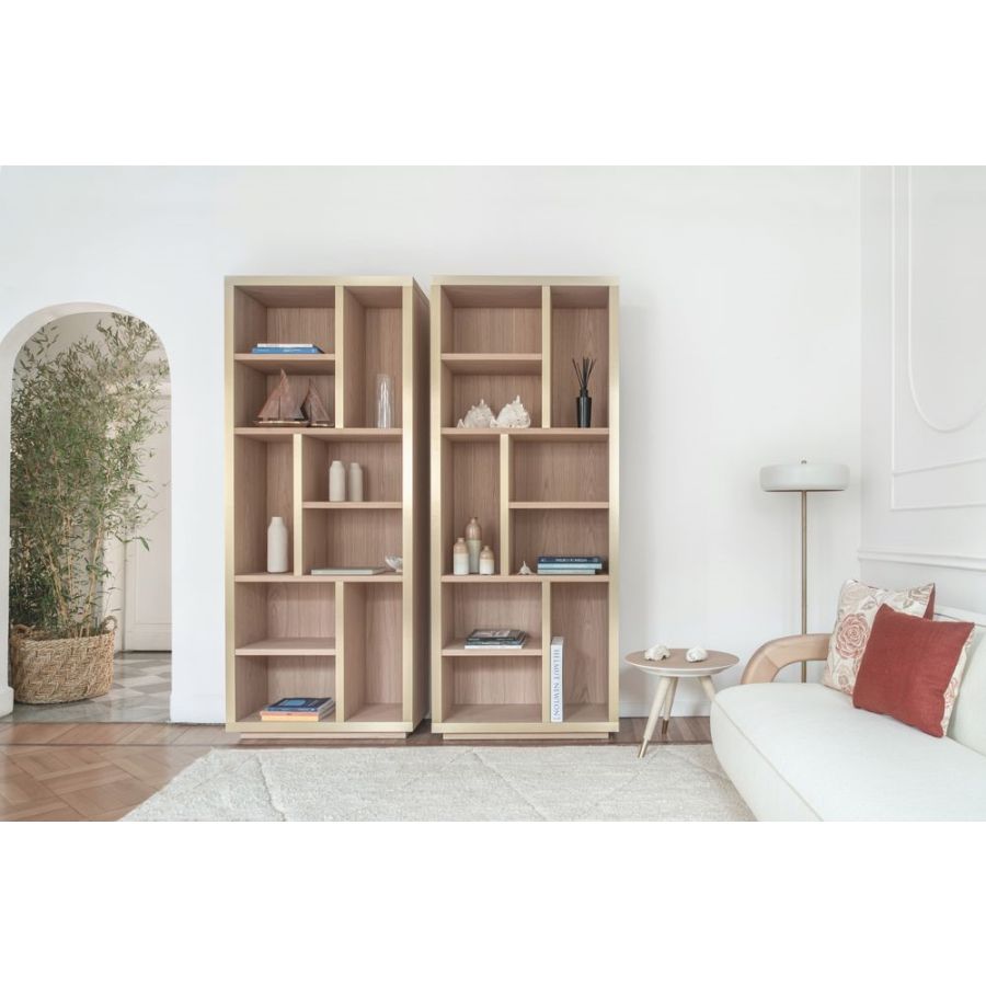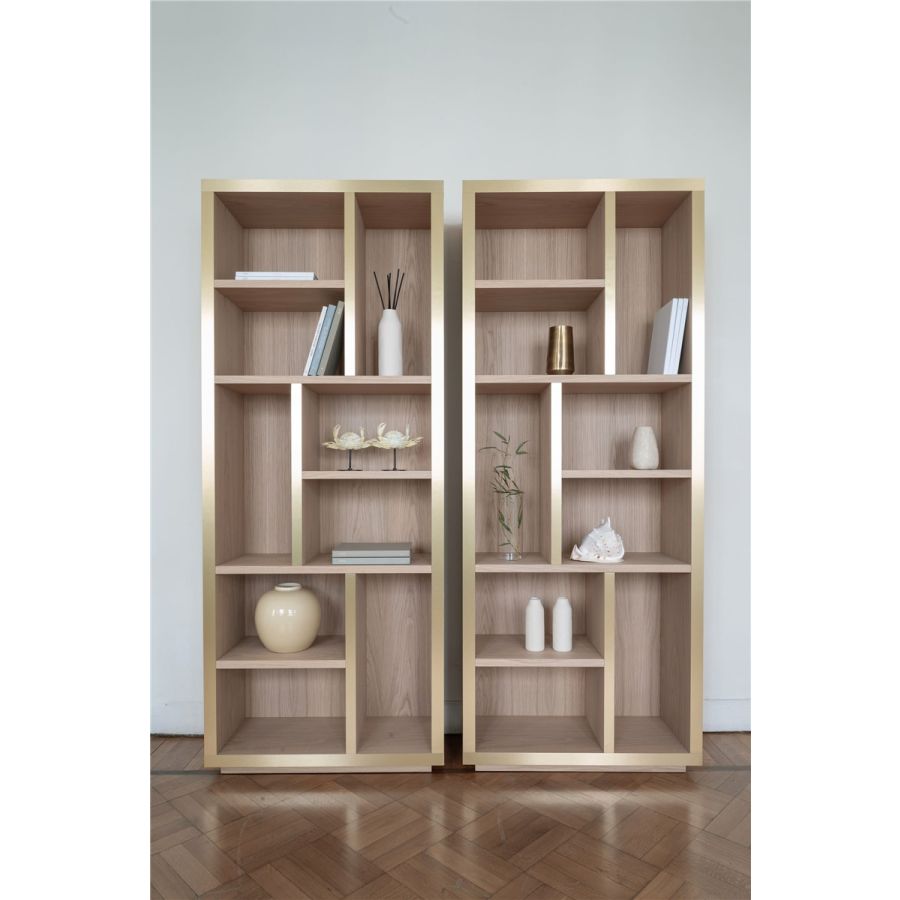 Maiori-bokhyllan är en slående pjäs som blandar naturligt trä med en delikat metallfront för ett slankt, rent utseende. Maiori-bokhyllans raka linjer och minimalistiska design gör den till ett mångsidigt tillskott i vilket bostadsutrymme som helst, samtidigt som form och funktion förenas för att skapa ett blickfång.