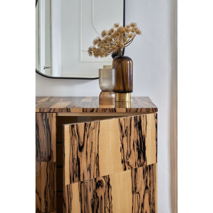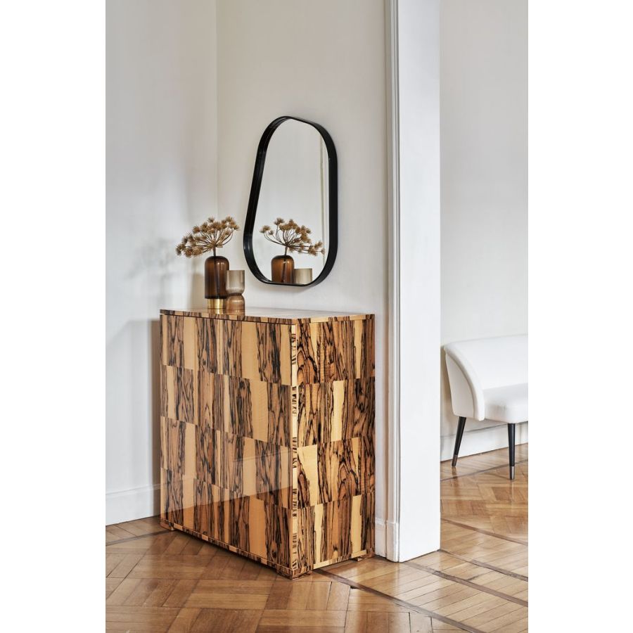 Genom att omtolka konceptet för traditionell förvaring i en iögonfallande design kommer detta exklusiva skåp att bli blickfånget i ett modernt vardagsrum och en matsal. Det lyxiga schackrutemönstret skapas genom att mästerligt sammanfoga bitar av Albinträ, vars imponerande naturliga träådringar framhävs av en blank lack. De två dörrarna har ett tryck- och draöppningssystem för att bevara designens harmoni och avslöjar en inre förvaring i blank, naturlig lönn med två hyllor. Ett föremål med stort visuellt genomslag, detta skåp visas bäst med minimala accenter.