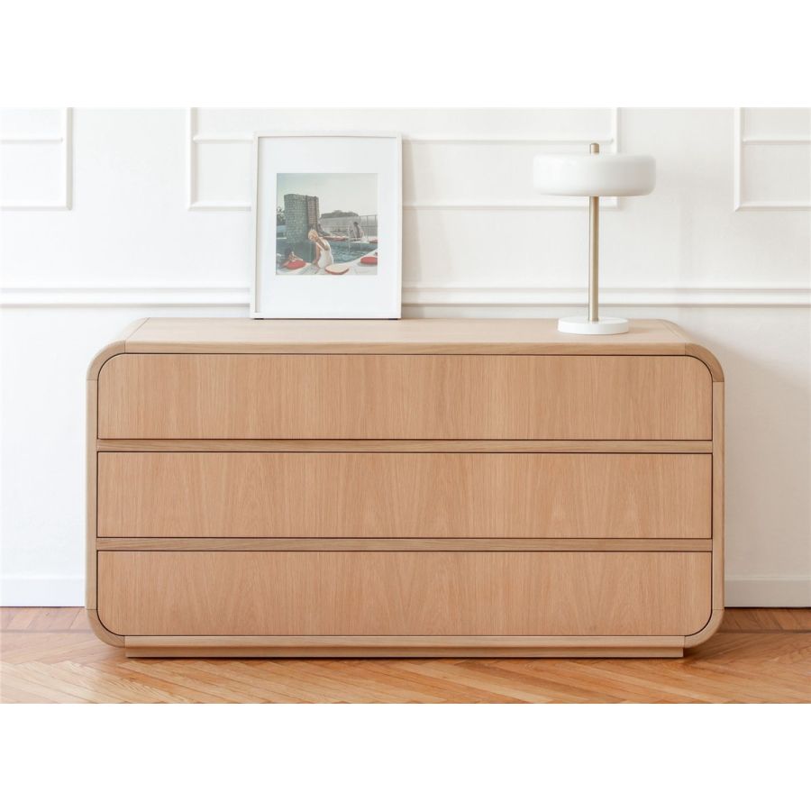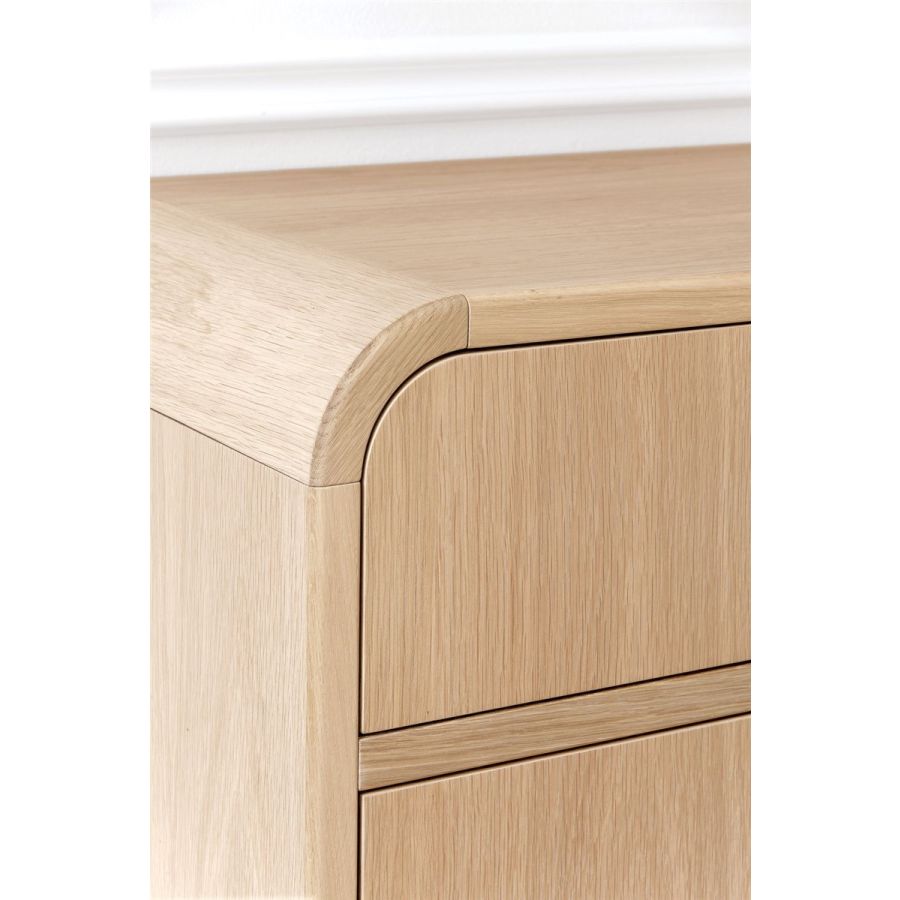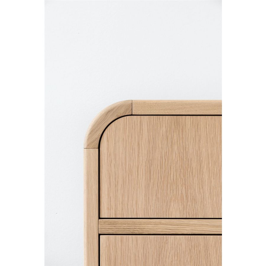 Både i byråversion och i sängbordsversion kommer Nathan med en Riviera-stomme i naturlig ek som gör den extra behaglig för ögat och vid beröring. Den kompletteras med tre frontlådor med push-pull-öppning.