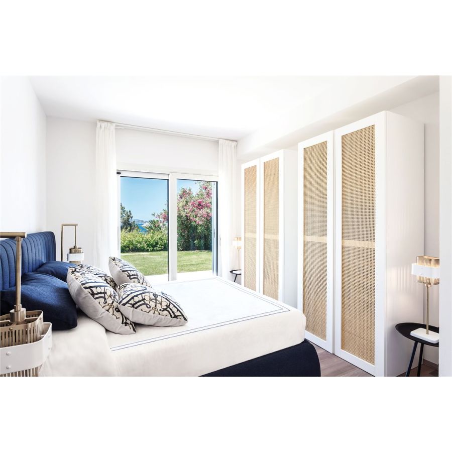 Linjer av stor enkelhet men stark personlighet för Quisisana Alto Dressing, ett skåp med en somrig, fräsch och lätt stämning. Vienna straw är en omisskännlig närvaro: ett ödmjukt material som är lätt att bli förälskad i, fullt av en suggestiv laddning från svunna tider. Dörrarna är lätta att öppna och stänga, tack vare materialets funktionella egenskaper och designlösningen, tack vare mekanismen som följer med rörelserna. Perforeringen i det naturliga materialet ger liv åt ett nätt spel av ljus och skuggor. Den mjuka rännan på dörrkanten är en diskret detalj att upptäcka och älska med tiden.