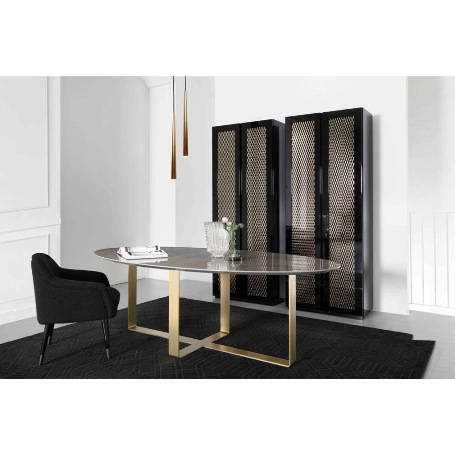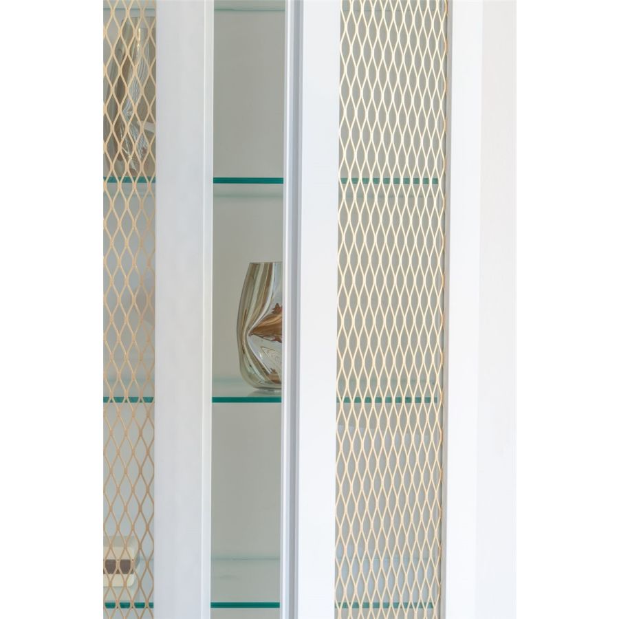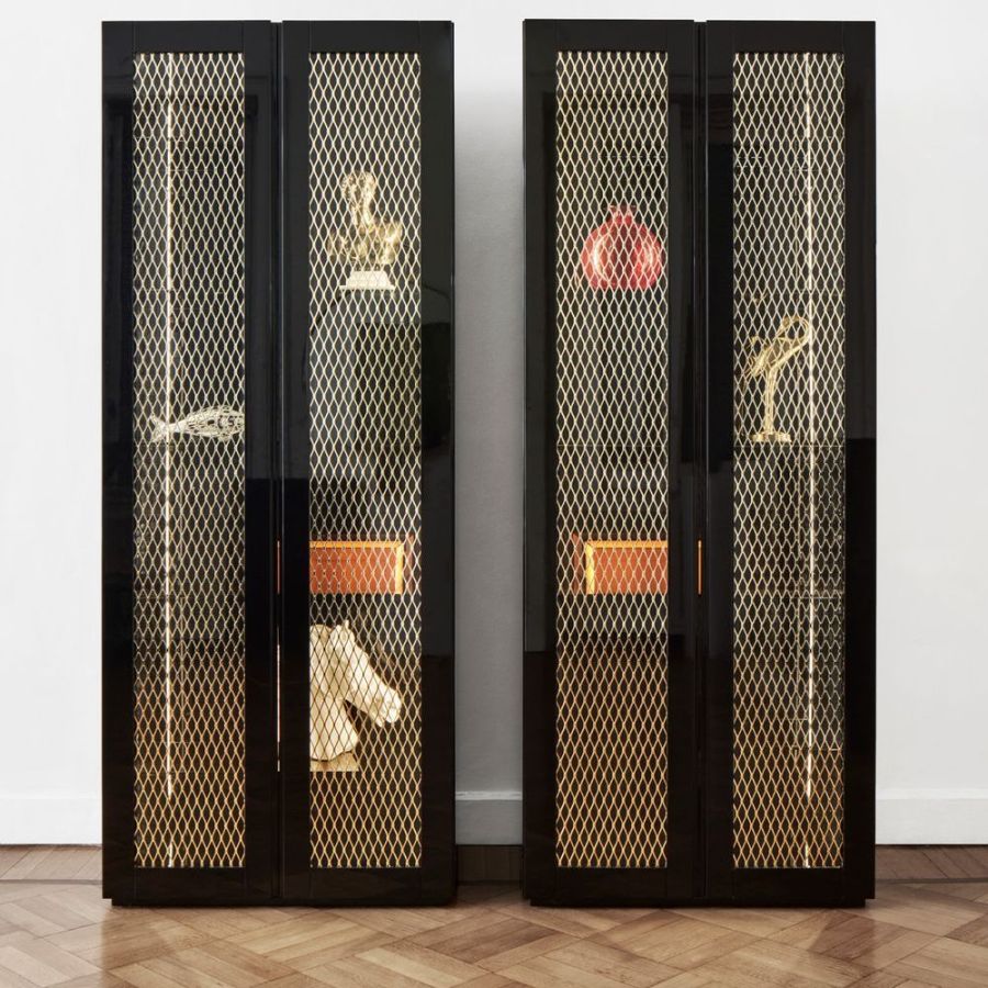 The Soho cabinet is available in glossy and matt lacquer and comes with metal grids in gloss brass, satin brass, bronze and gloss chrome. Interior shelves available in bronzed glass, clear transparent or fumè. The glass doors behind the metal grids are available in mirror, bronzed, fumè or clear transparent.