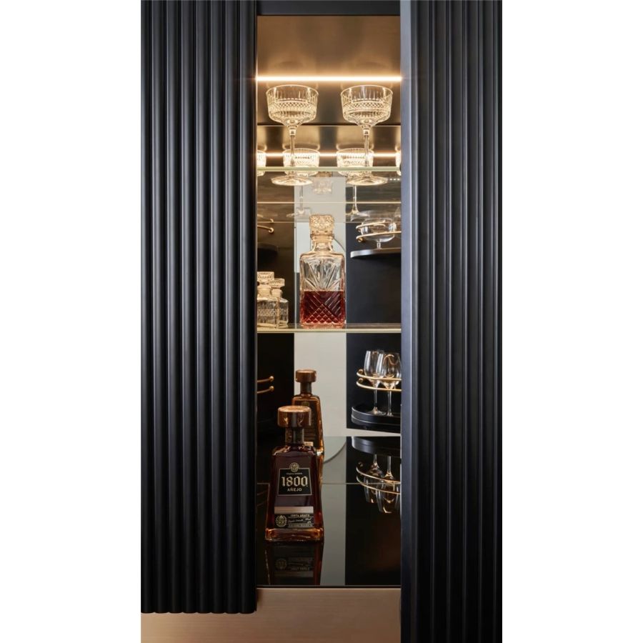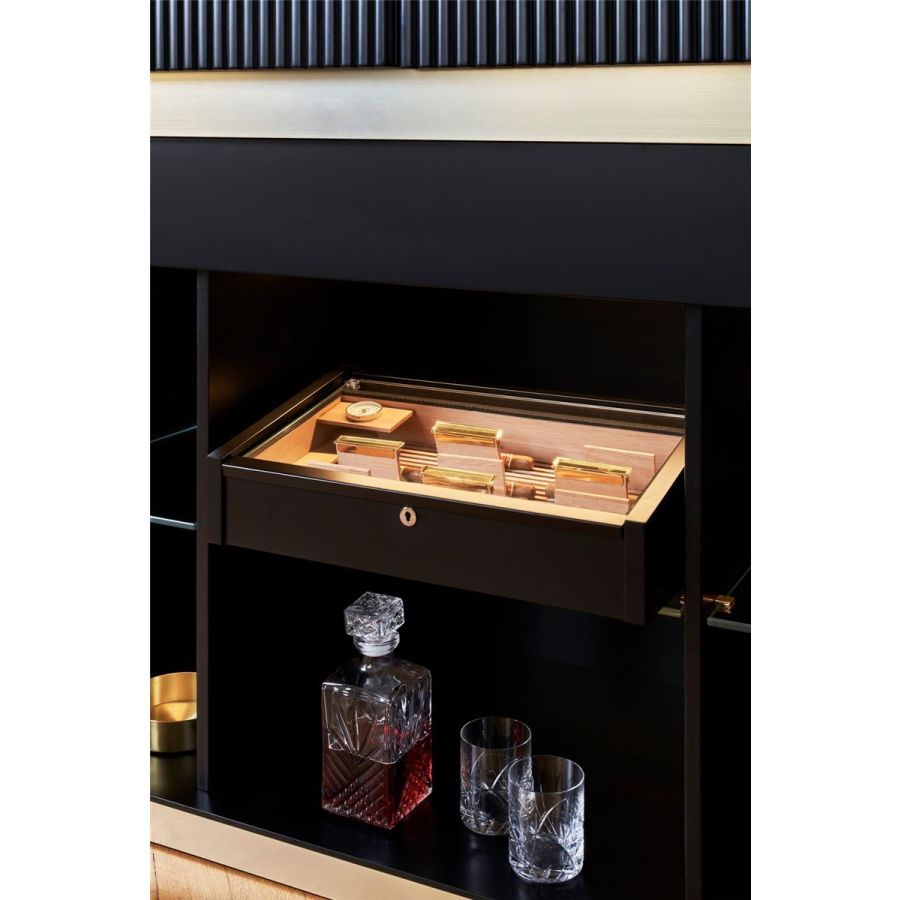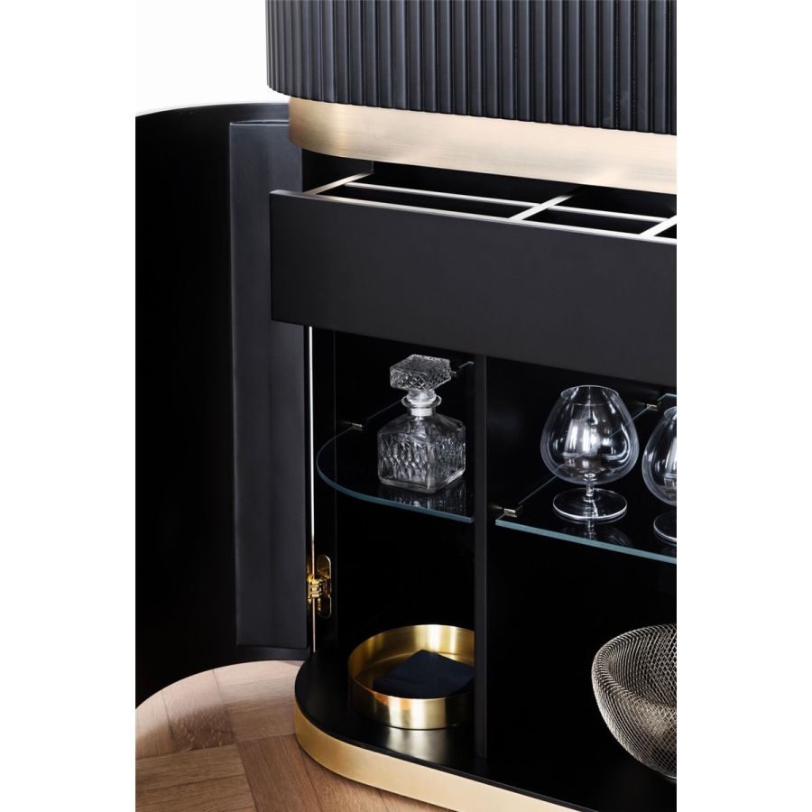 Tiffany, ett mycket dyrbart möbelstycke, skapar en atmosfär i balans mellan Medelhavets ljuva liv, en elegant sommardrink i Manhattan, en intim och överdådig atmosfär i ett klassiskt cigarrum. Allt detta kommer in i hemmet genom de rundade och proportionerliga linjerna, de vertikala kannelerade ytorna, de polerade eller satinerade metallbanden, och framför allt de vackra interiörerna: såsom hos ett barskåp som utan tvekan spelar huvudrollen – ett objekt man aldrig bör ta för givet, och med stark individualitet. För en uppfattning av lyx som inte består av pompa, utan av personlighet, atmosfär och passion.