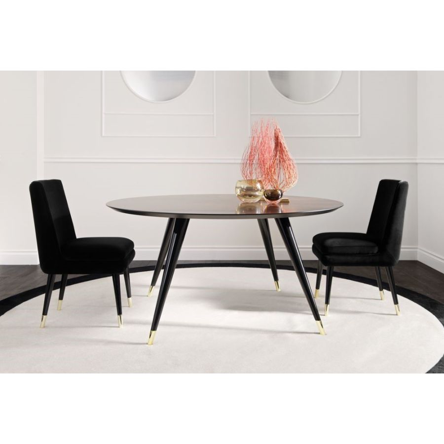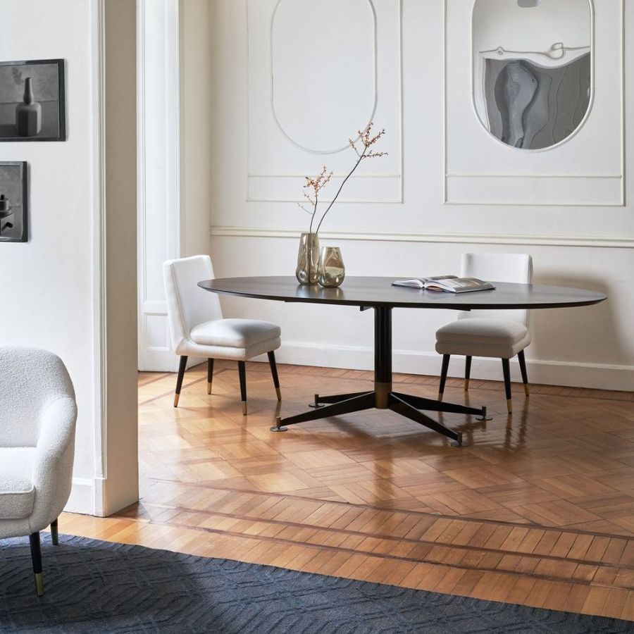Vår Diana matstol har en sofistikerad stil inspirerad av 1950-talets inredning. Inte bara för matplatser, Diana kan också användas som en accentmöbel i hallen eller som skrivbordsstol i arbetsrummet. Dess eleganta och feminina form är gjord av trä med smala och vinklade ben, behandlade med blank eller matt lack och prydda med metallspetsar i blank mässing, satinmässing, blank krom eller brons. Överdelen av stolen har ett klätt ryggstöd och en extra dyna på sitsen, vilket skapar en balanserad och bekväm design.
