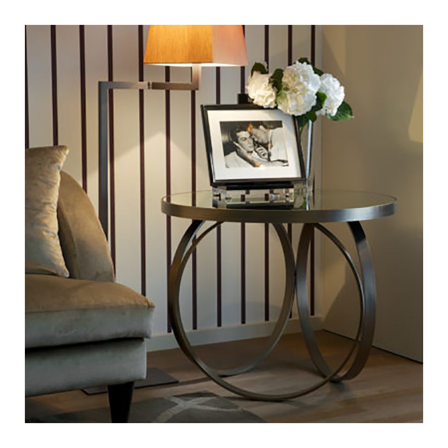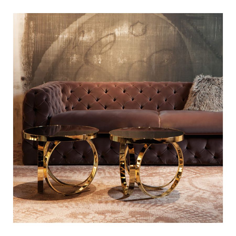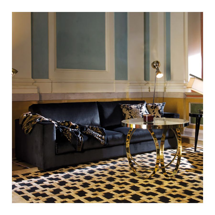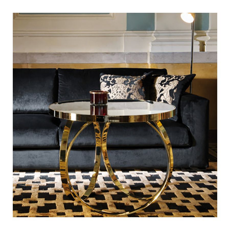 Ottoline består av en topp i marmor eller glas som stöds av en metallstruktur: föreningen av tre cylindriska element som är perfekt balanserade intill varandra. Metallstrukturen avslutades sedan runt toppen med ett annat cylindriskt element som löper längsmed och skyddar hela profilen. Ottoline småbord är resultatet av våra hantverkares känsliga och skickliga händer och den omsorg de ägnar åt den kurvade formningen av galvanisk metall.