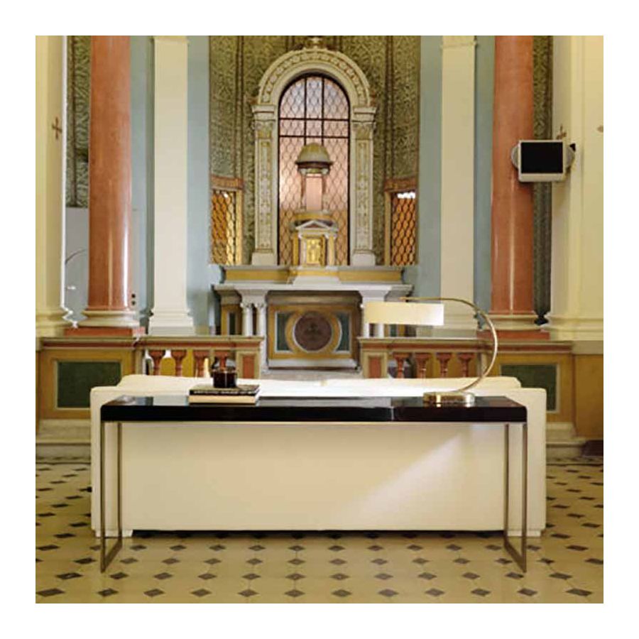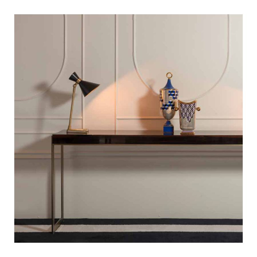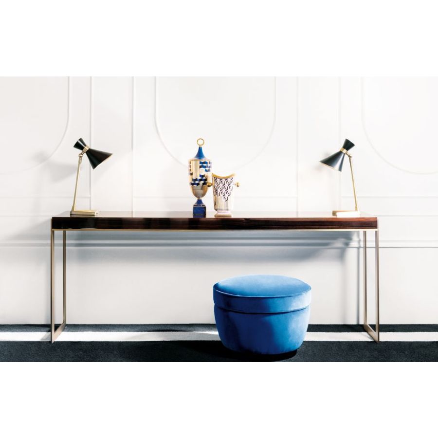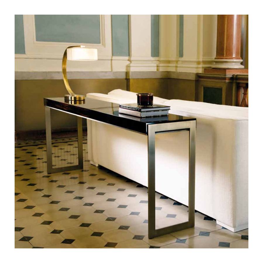 Stephanie-konsolen är både perfekt och minimalistisk. Designad med syftet att på ett samtida sätt gestalta begreppen ordning och noggrannhet. Toppen finns tillgänglig både lackerad och i Makassar-ebenholtsfanér. Den stöds av två mycket tunna och vertikala pelare som förenas av ett centralt element som löper längs hela toppens yta och markerar den nedre profilen.