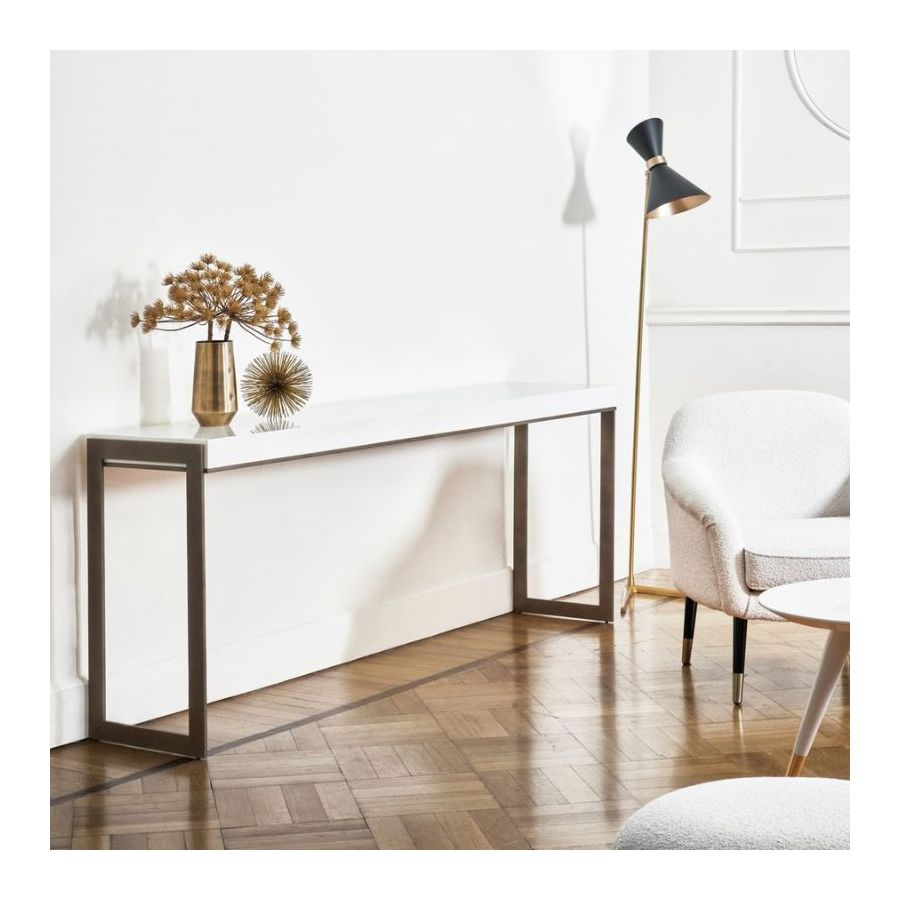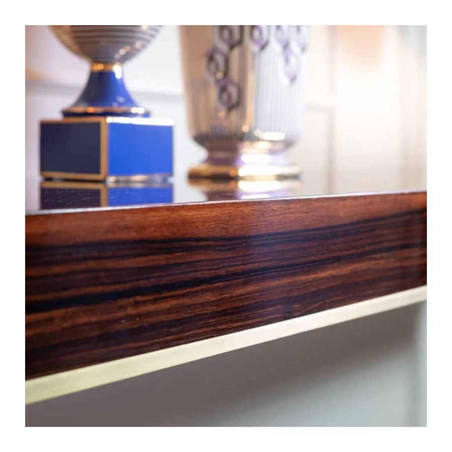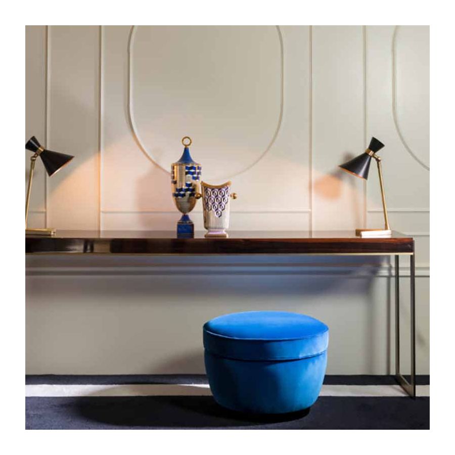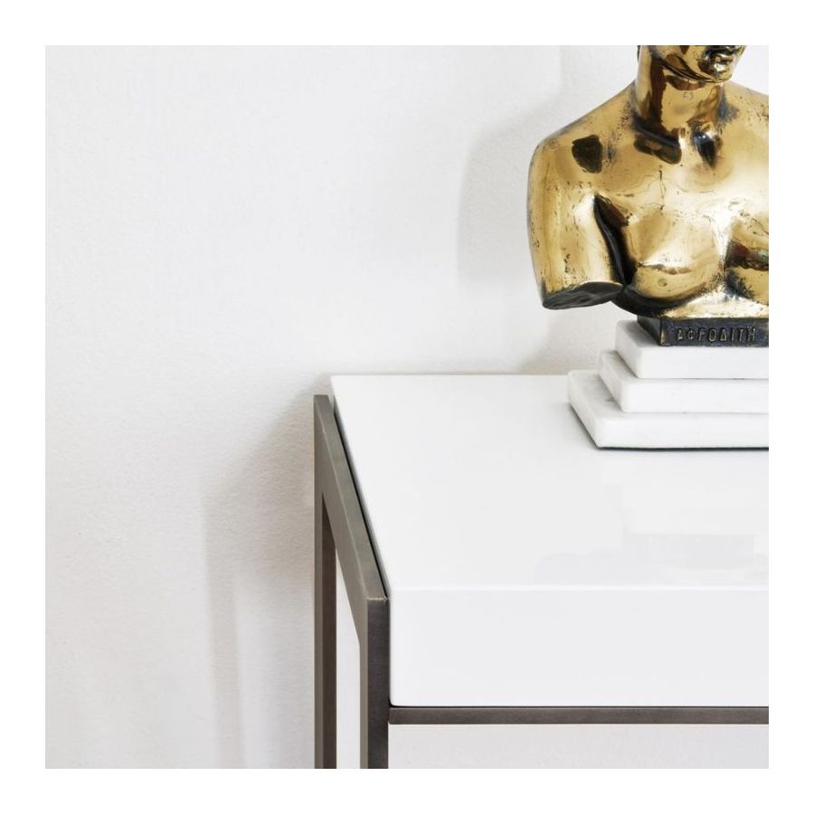 Stephanie-konsolen är både perfekt och minimalistisk. Designad med syftet att på ett samtida sätt gestalta begreppen ordning och noggrannhet. Toppen finns tillgänglig både lackerad och i Makassar-ebenholtsfanér. Den stöds av två mycket tunna och vertikala pelare som förenas av ett centralt element som löper längs hela toppens yta och markerar den nedre profilen.