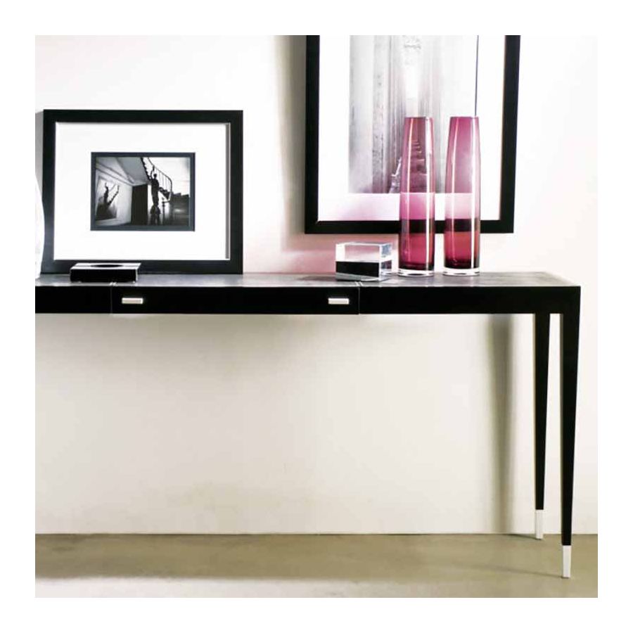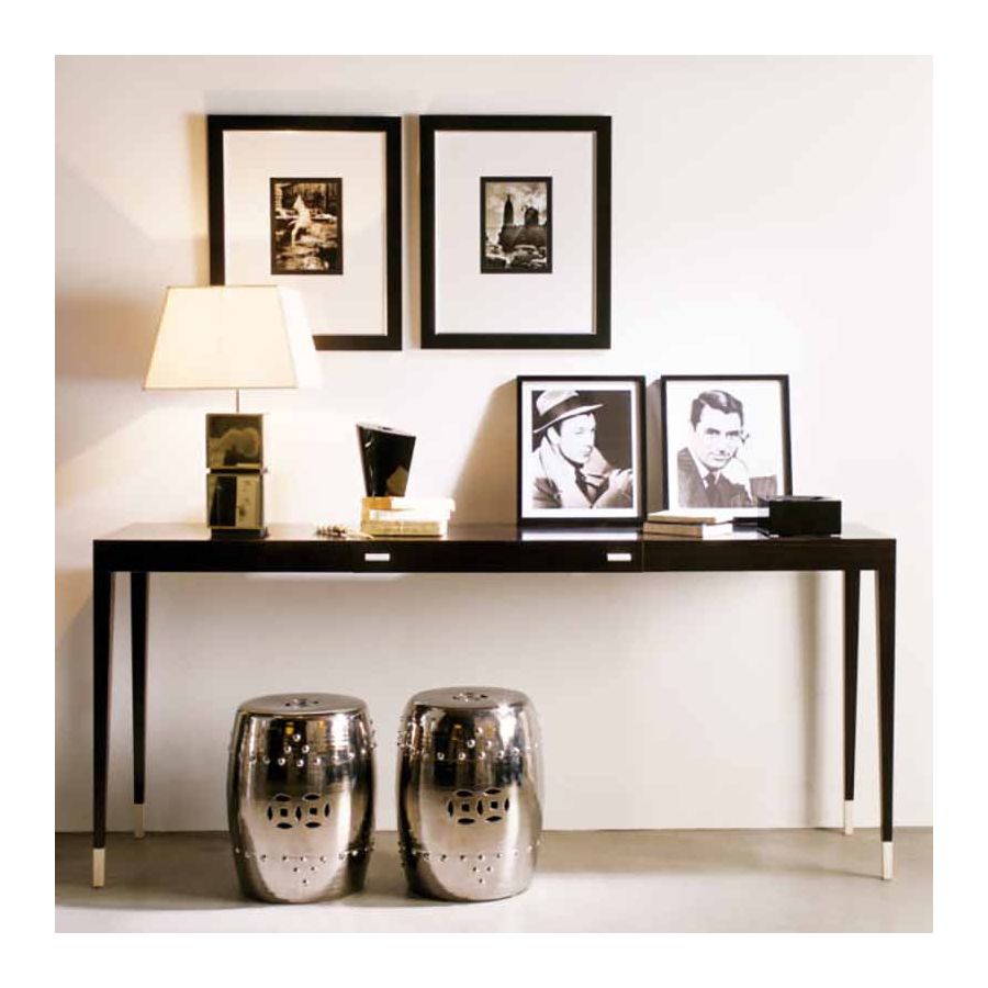 Stram geometri och en lätt silhuett skapar den sofistikerade designen hos denna utsökta konsol. Den tidlösa kvaliteten hos denna möbel gör den till ett idealiskt inslag i både klassiska och moderna interiörer. Stommen är utförd i makassar-ebenholts eller i matt- eller blanklack, med accenter i metall som tillför en subtil accent åt spetsarna på de smala och koniska benen samt handtagen på den enda lådan.