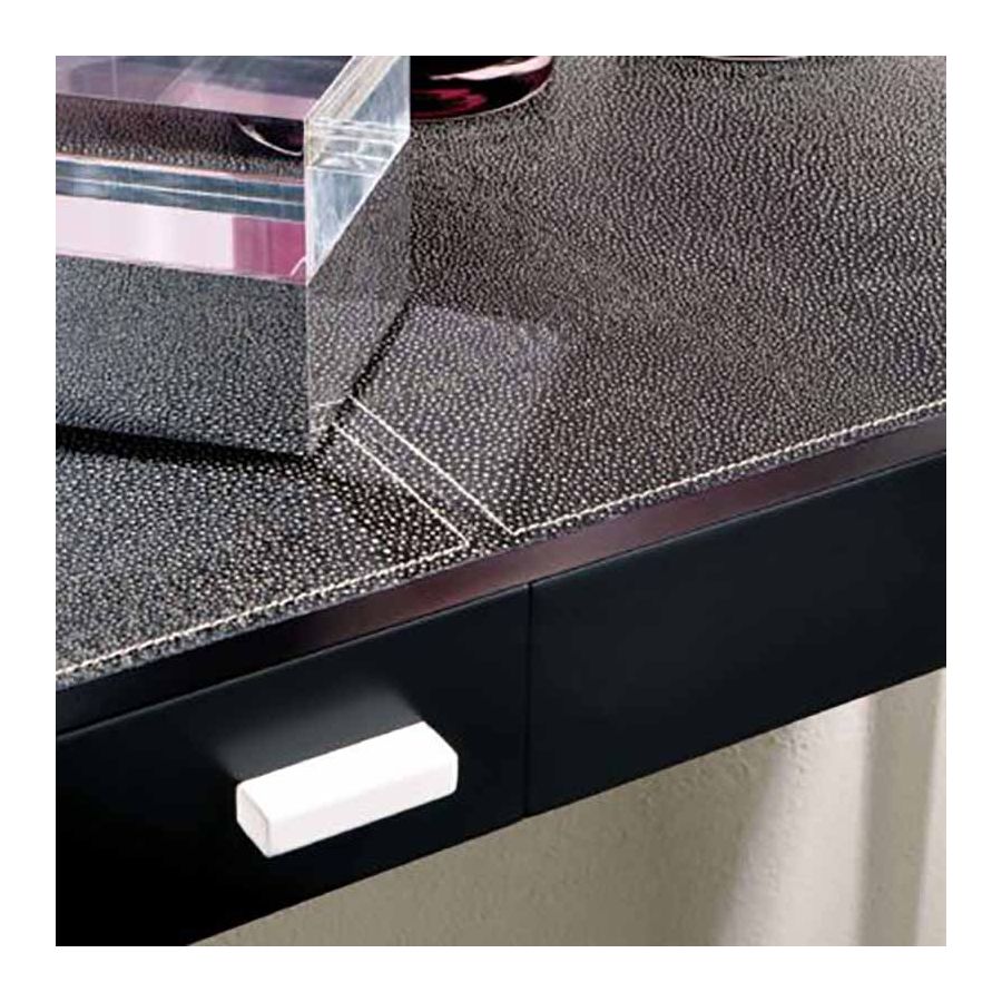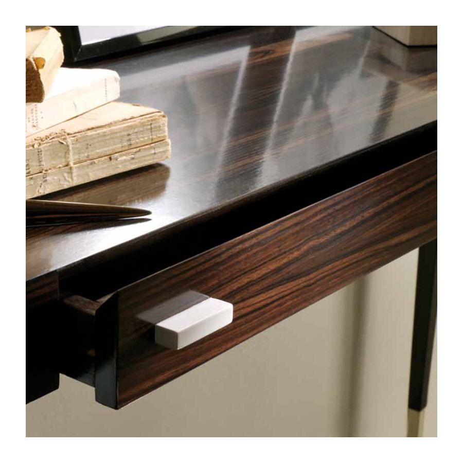 Zoe-skrivbordet levereras med ett överstycke i makassar-ebenholtsfanér, blankt eller matt lackerat - finns även med en svart eller elfenbensfärgad läderinsats med galuchat-effekt - och ben som är mattlackerade. Metallknopparna och spetsarna finns i brons, satinmässing, vitlack eller svartlack.