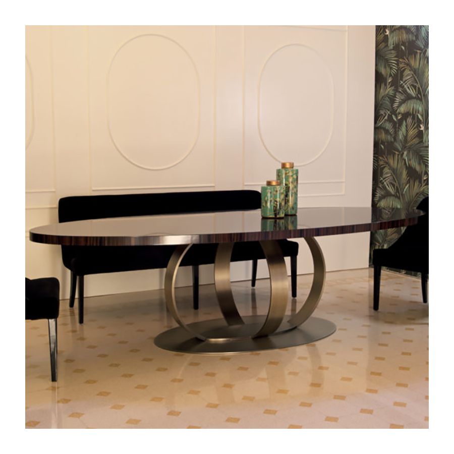 Andrew matbord är ett skulpturellt bord. Dess utmärkande drag är basen i metall, tillverkad av flera böjda komponenter som perfekt smälter samman för att skapa ett enhetligt element i satinmässing, blank mässing, brons eller krom. Andrew intar scenen med majestät och självförtroende.