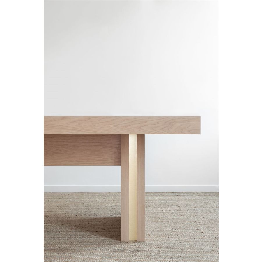 Bordsskiva och ben i riviera-ek natur/ vitbetsad/ svartbetsad. Detaljer i metall: blank mässing/ satinmässing/ blank krom/ brons/ tenn/ molnig brons.