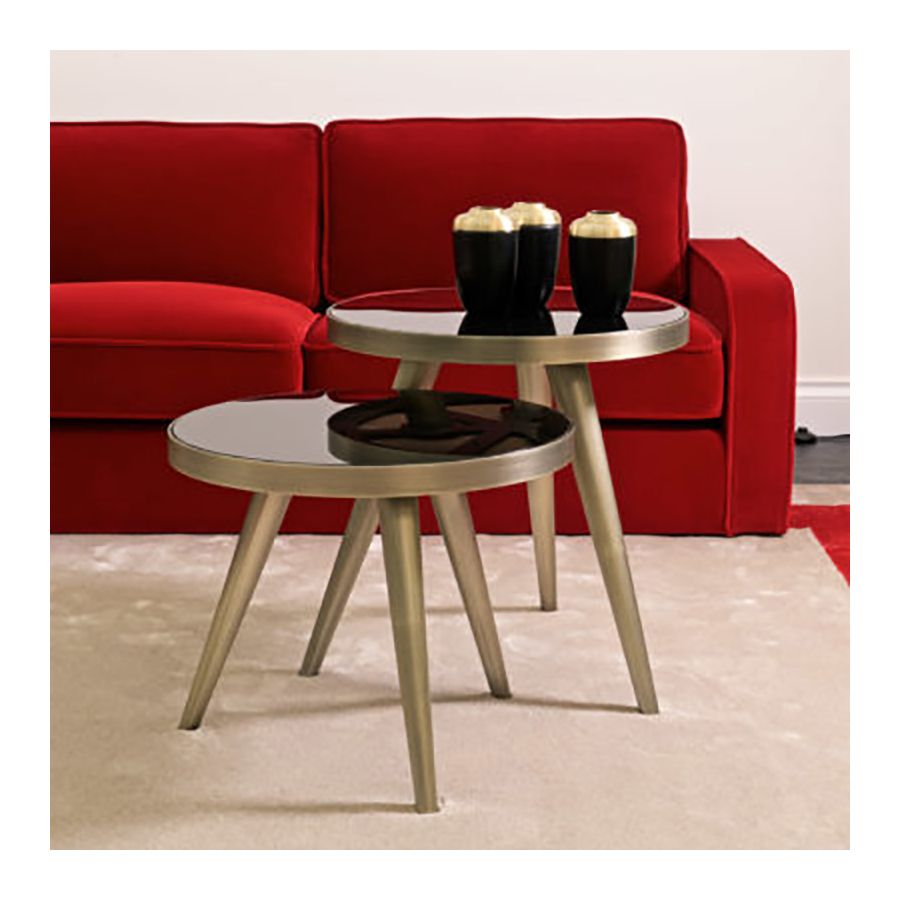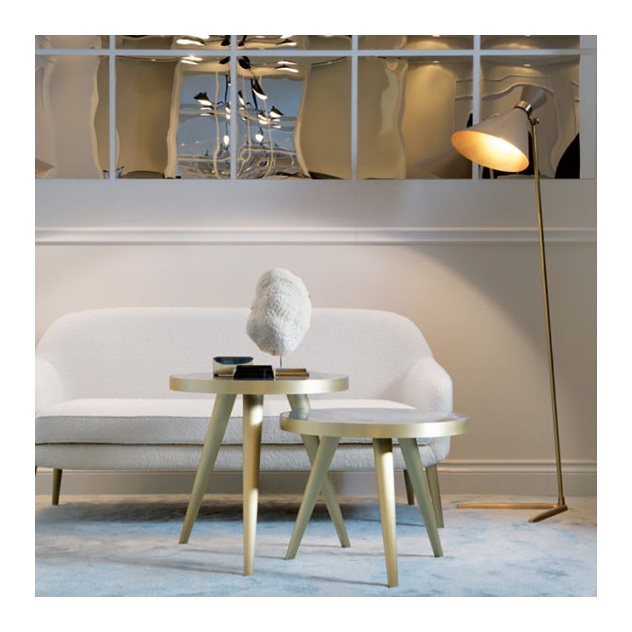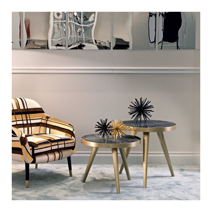 Toppen finns i Zebra svart marmor, lila-vit marmor, Dover vit marmor, blank eller matt macassar-ebenholt, lera/naturligt blank lönn, svart eller vit lackerad eller blank albinträ. Metallbenen finns i blank mässing/ blank krom / brons/ satinmässing/ tenn/ molnig brons.| Mått (HxBxD): | cm: 45 / inch: 17.72" |