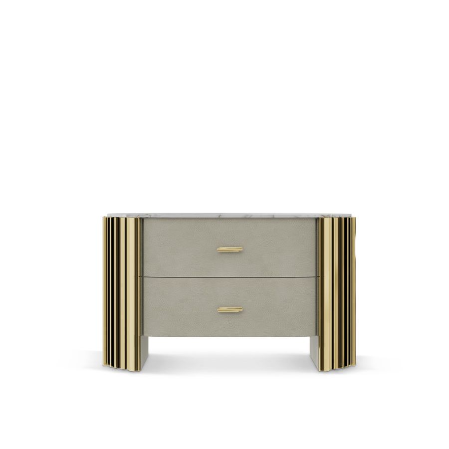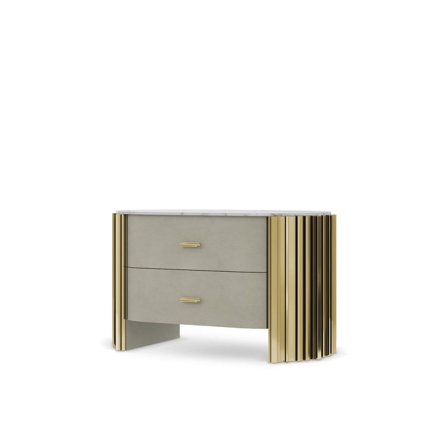 The Empire Nightstand channels the bold geometry and timeless elegance of LUXXU's most iconic collection, bringing a refined presence to any bedroom interior. Crafted from a luxurious blend of polished brass, Nata leather, Nata lacquer, and Carrara marble, this bedside table strikes the perfect balance between classical sophistication and modern design. A true statement of prestige and taste.