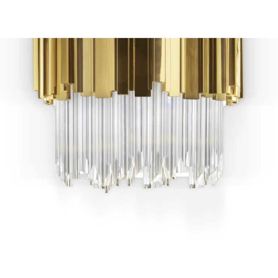 Portraying the same extravagant lines as the Empire family, the Empire Wall Small Lamp provides intimate lighting with a lavish design, with delicate layers of gold-plated brass and crystal glass creating a glamorous atmosphere in whichever room they’re placed.