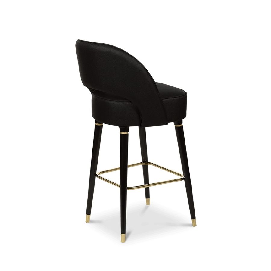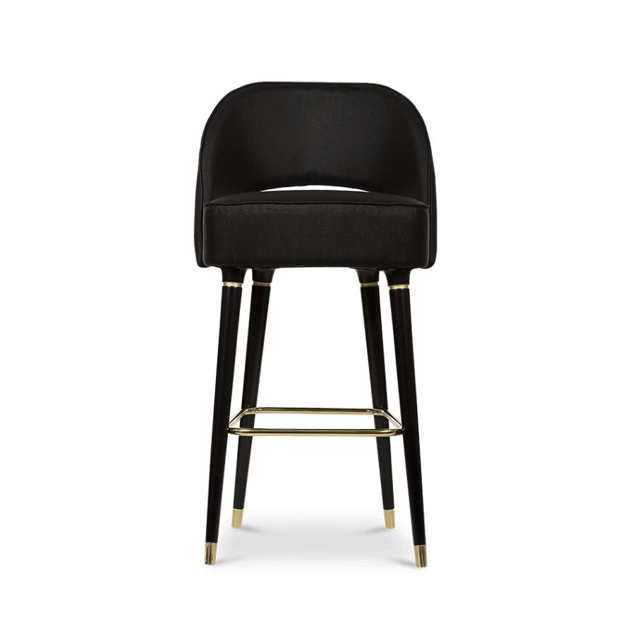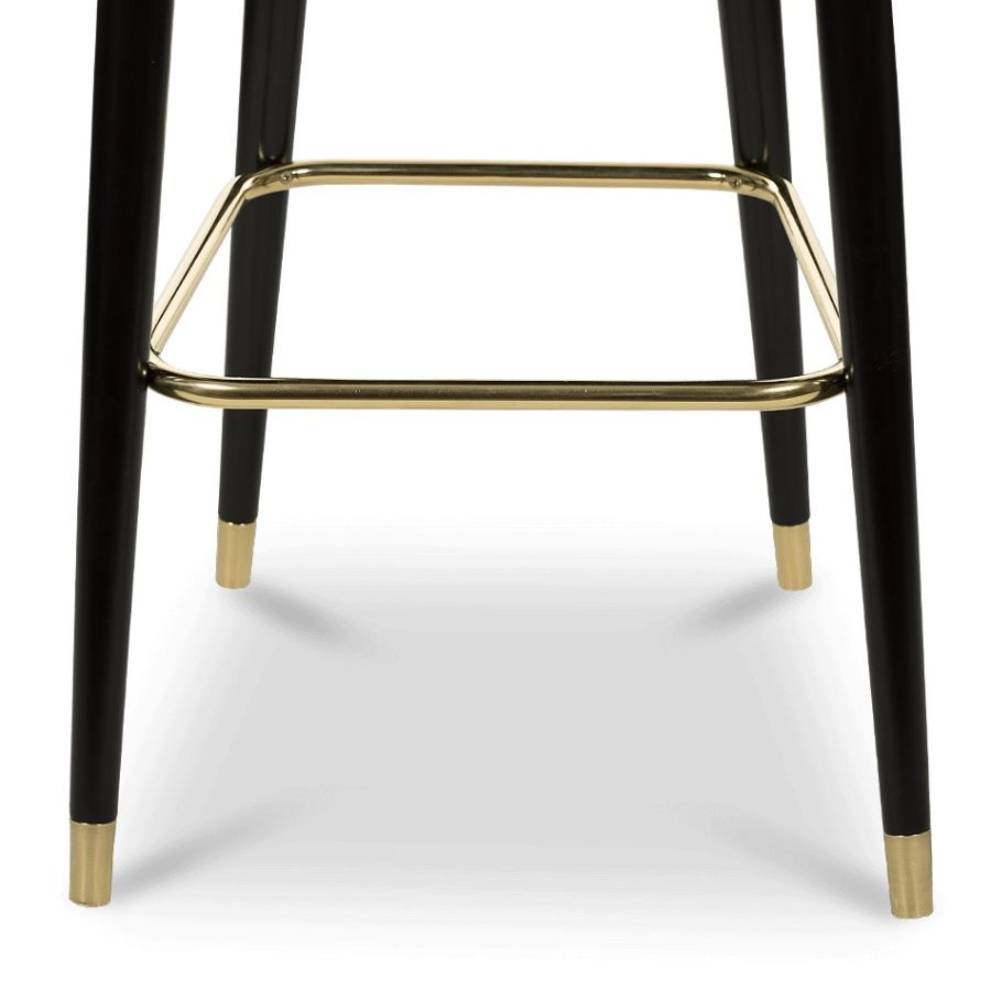 Collins, a stunning mid-century modern bar chair, exudes unparalleled glamour and style. With sleek lines and a crescent open-back design, it's truly unique. The glossy black legs, accented by metal details and a foot rail, add to its allure. The luxurious upholstery adds a touch of elegance, making it a perfect statement for your bar furnishing.
