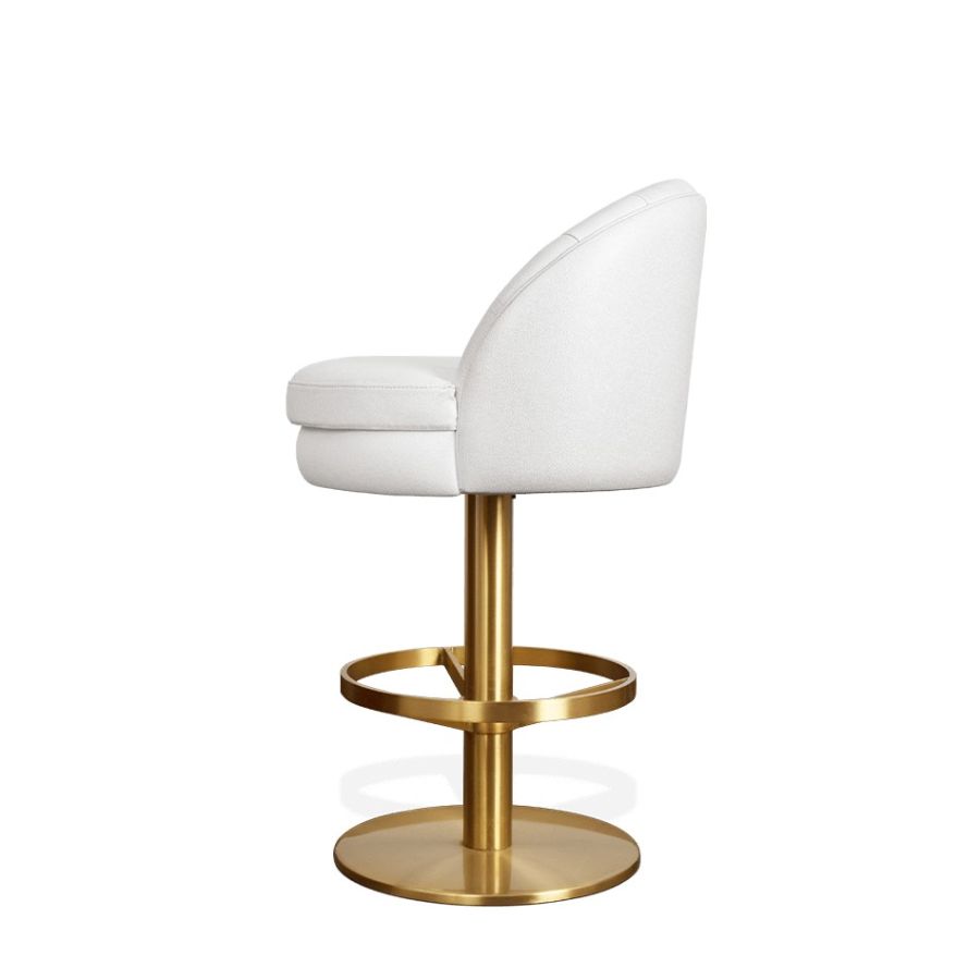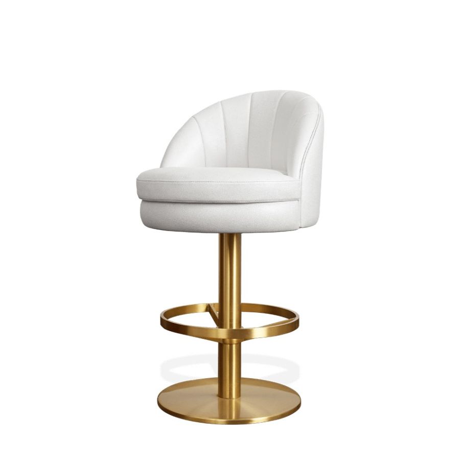 Feel like you're sitting on cotton candy or a cloud with this perfect mid-century bar chair. Gable features a shiny round base and a footrest in polished brass. It is fully upholstered in cotton velvet and features a super stylish design with an accent low back and a cylindrical shape.
