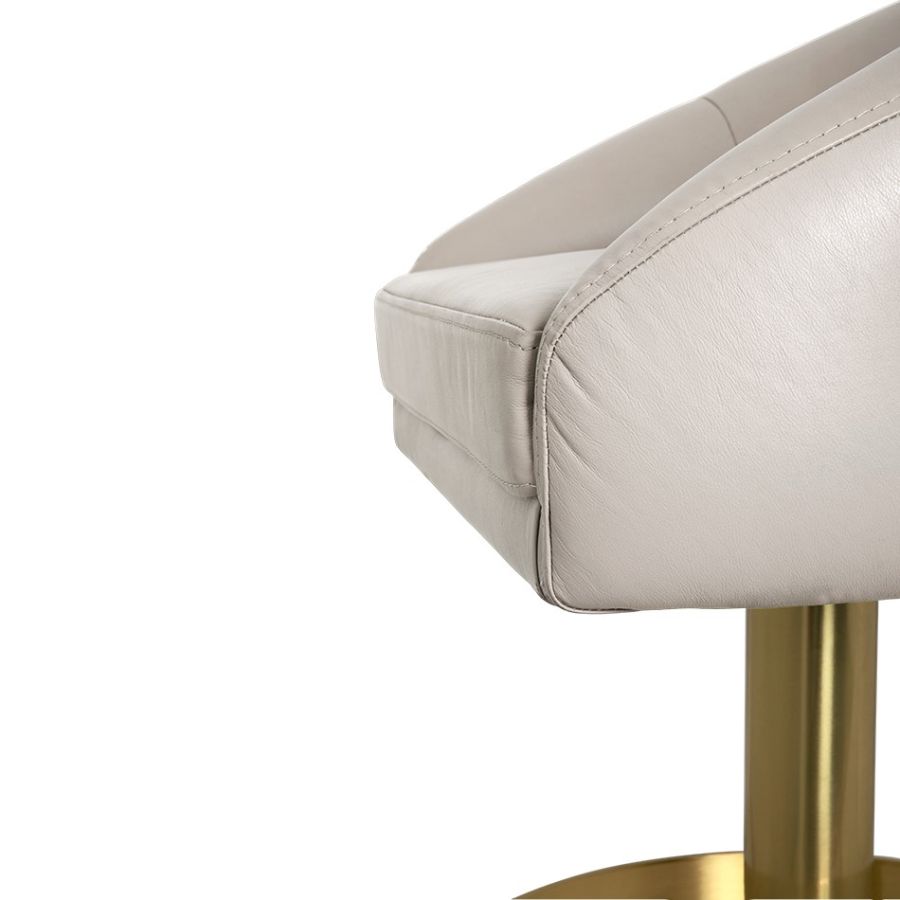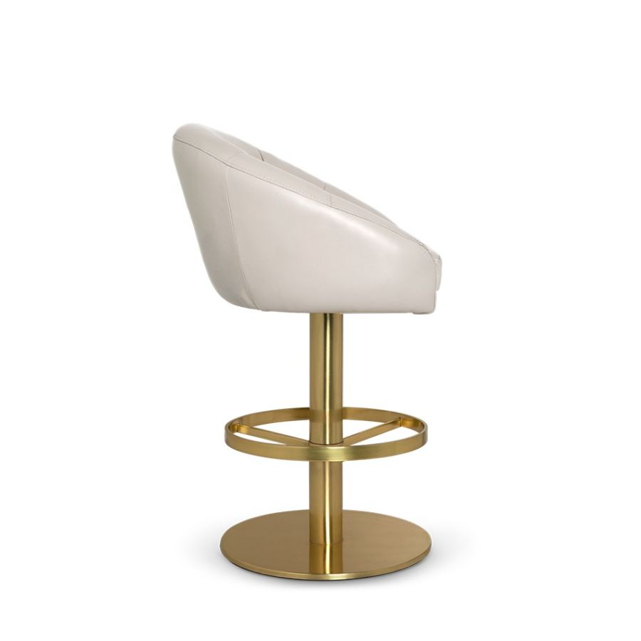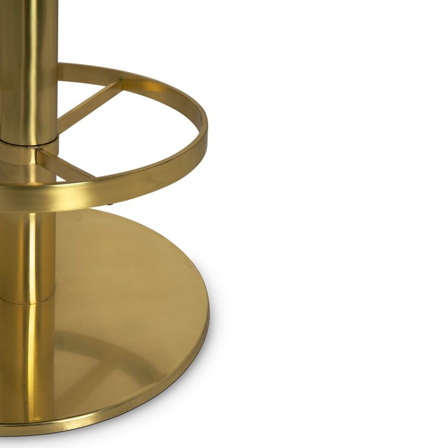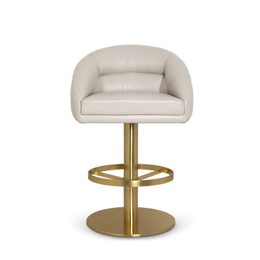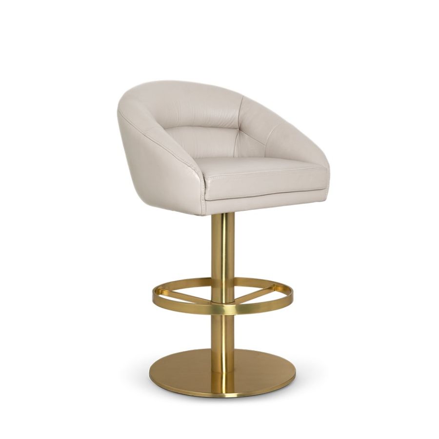 Mid-century design with a contemporary twist in a bar chair perfect for any home. An accent bar chair with a round shape body supported by a polished brass base and a footrest for comfort. Mansfield is upholstered in a sophisticated velvet and stylish design.
