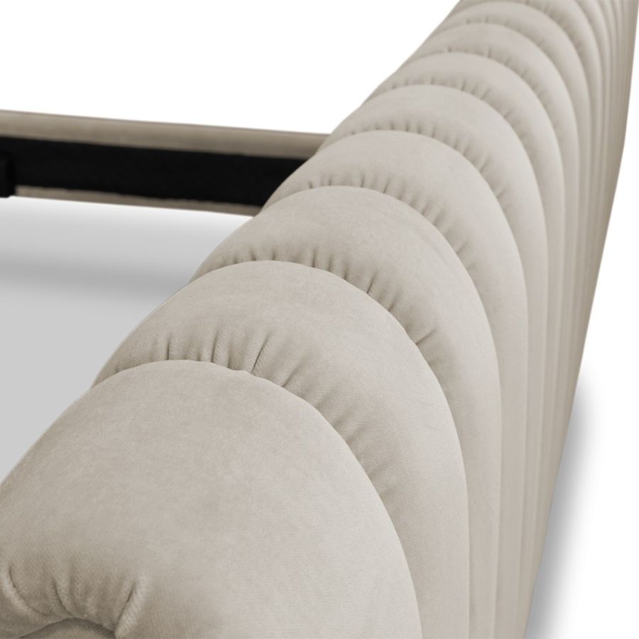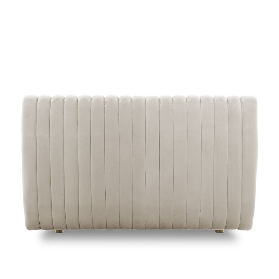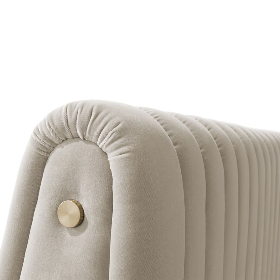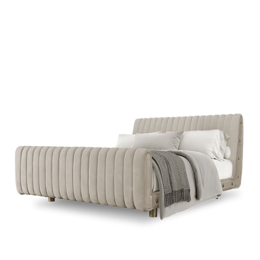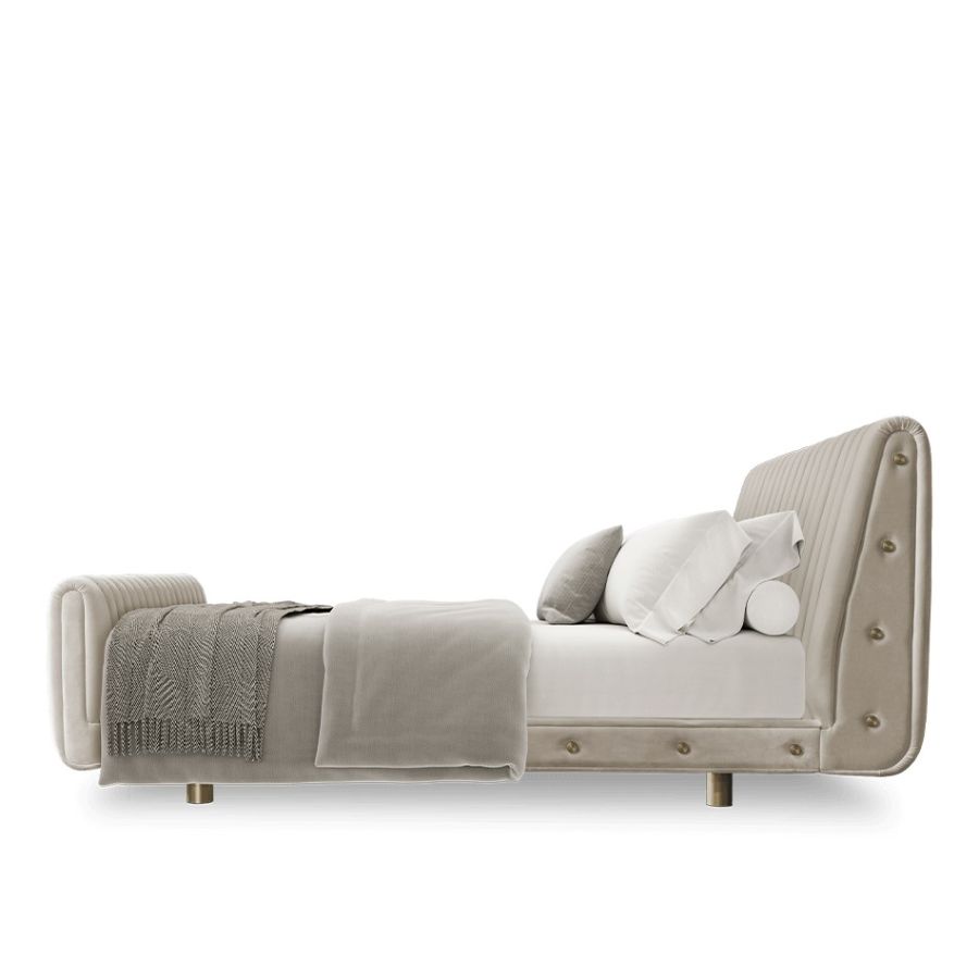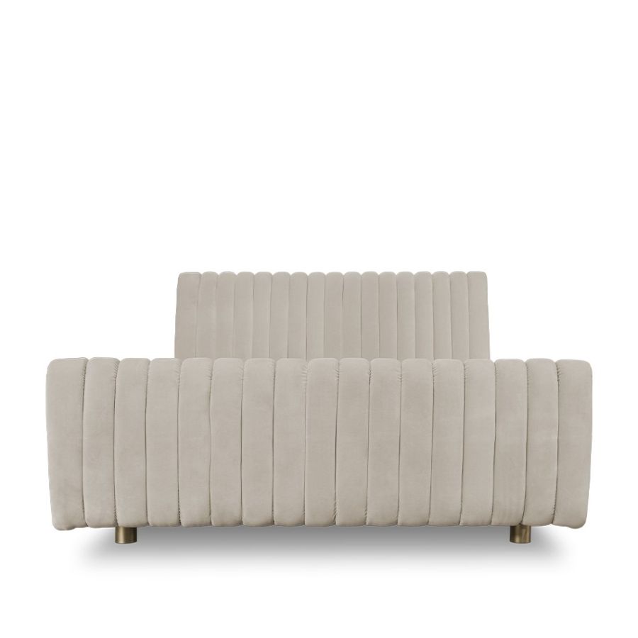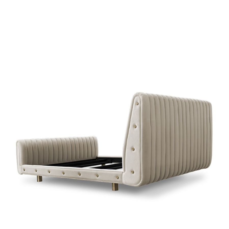 Sophia is a mid-century styled panel bed with bonded velvet on the headboard and footboard, perfect for any bedroom. Expertly stitched from the top to the bottom and accented with tufted metal buttons on both sides, proving high quality stunning details. It features legs also made of metal, turning this bed into an inspiring retro furniture piece.