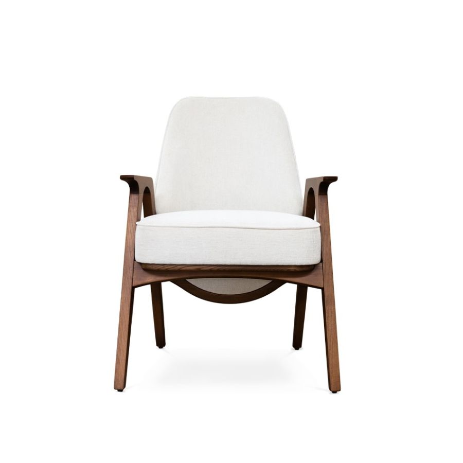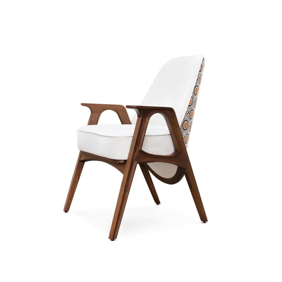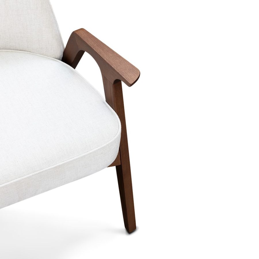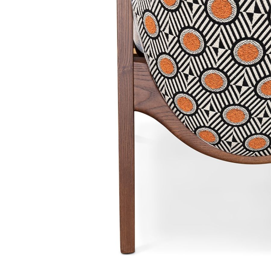 Like its family, Hadley chair reflects the best of the '30s. A timeless and flawless design. Wooden legs and armrests pair wonderfully with a customizable fabric for the seat and an art deco pattern on the back. This versatile piece is the perfect fit for a lounge or hotel lobby, or even as an accent dining chair alongside its counterpart.