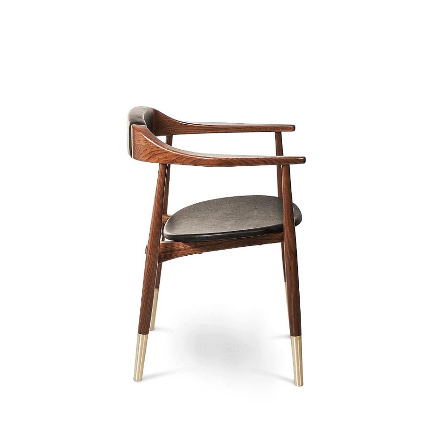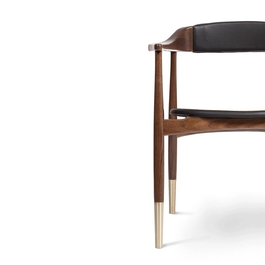 Inspired by the most famous occasional designs, a mid-century masterpiece and an homage to the modern living era. A durable and solid chair features a body structure produced in solid walnut wood. The seat and the back cushions are softly upholstered, contrasting with metal shoes on their legs.