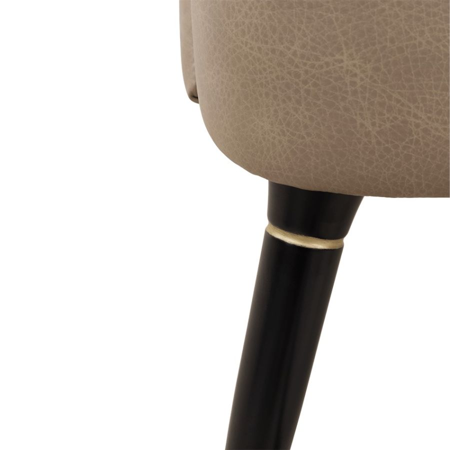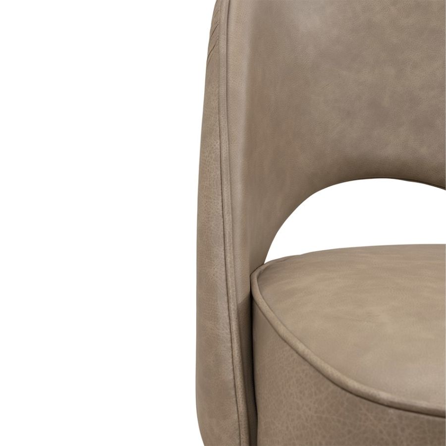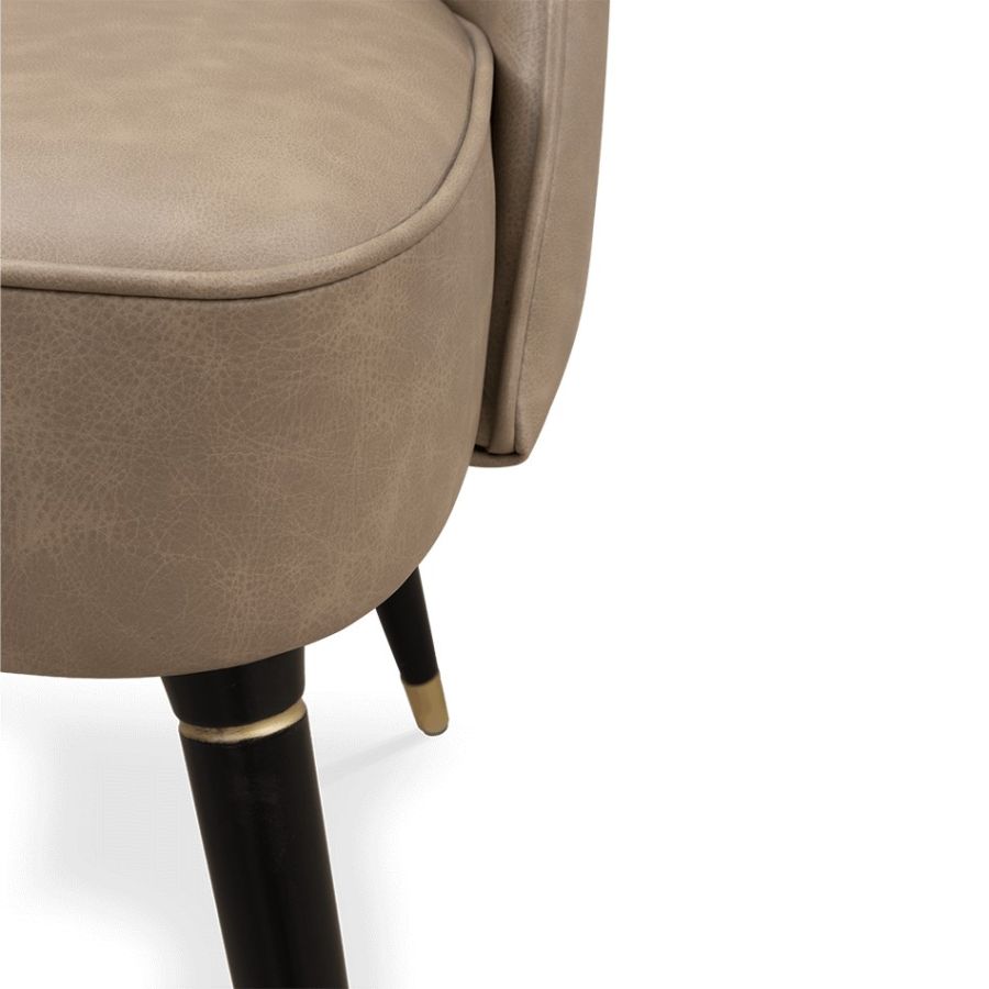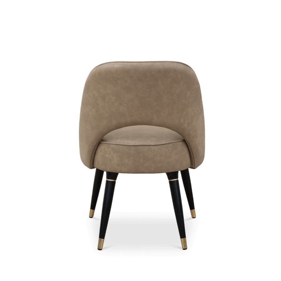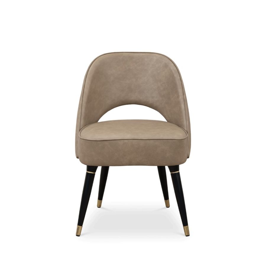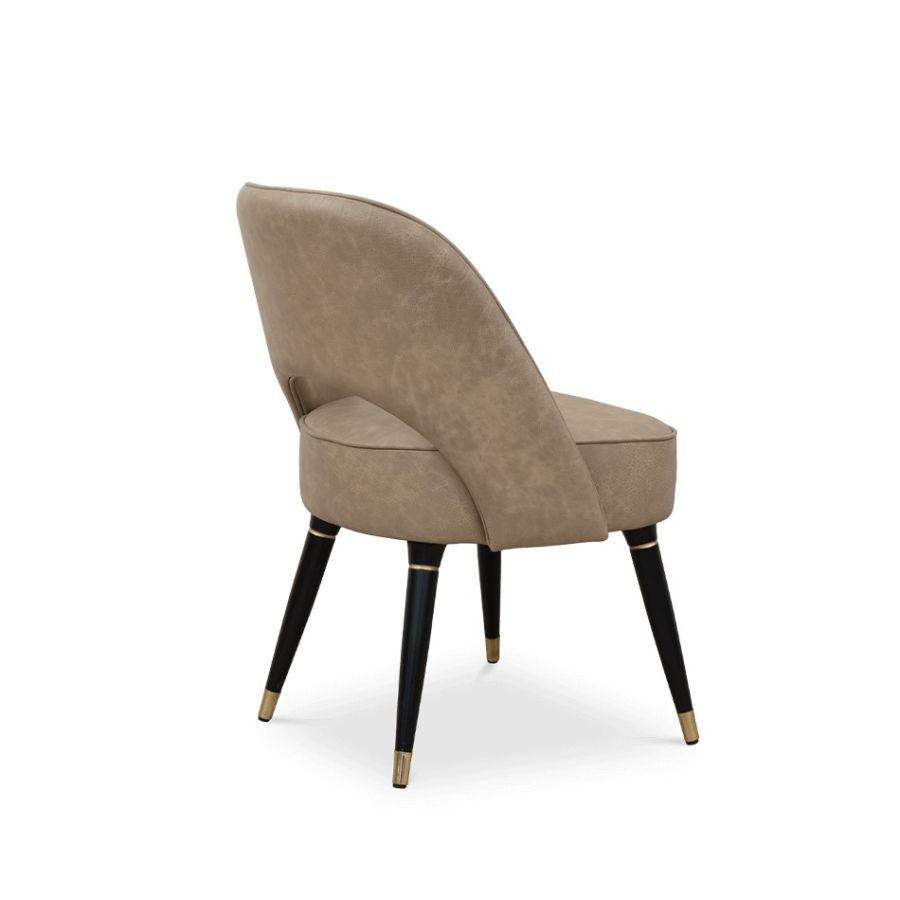 Designed with a classic retro chic feel, comfortable and perfect to pair with a any type of dining table. Finely upholstered, welted stitches on the seat, and a stylish degree reclining on the crescent open back. It features a perfectly curved back, supported by elegant tapered legs with rich accents of metallic details.