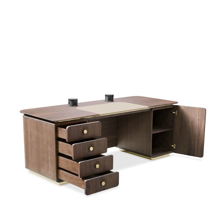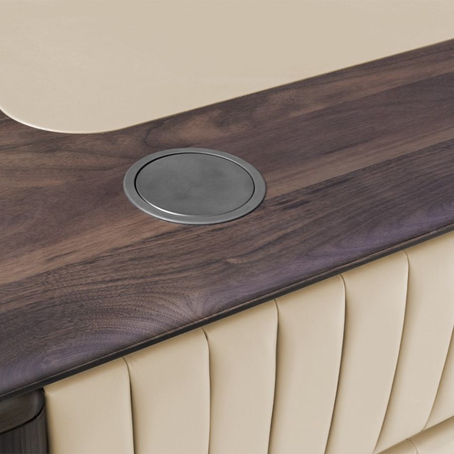 Arne Desk, a stunning mid-century furniture piece that will make a great addition to any home office. It adds a touch of luxury with metallic details and a particularly elegant textile padding on the front, working alongside solid wood. It's the perfect piece for design lovers that want a piece of the past with all the luxury of the present.