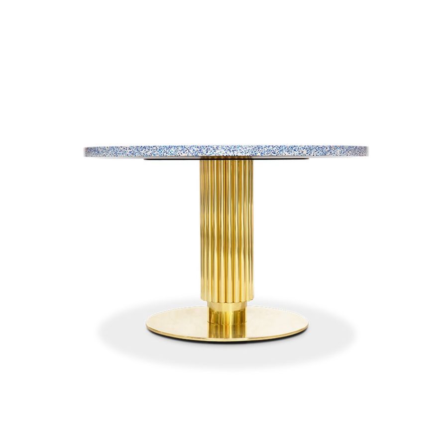 The Cary dining table, inspired by Cary Grant, is a unique masterpiece by Masquespacio. Just like the movie 'An Affair to Remember,' it perfectly complements the Kerr Dining chair designs, creating a strong visual impact with gold and terrazzo elements. Embrace the classic Hollywood charm with this remarkable furniture piece.