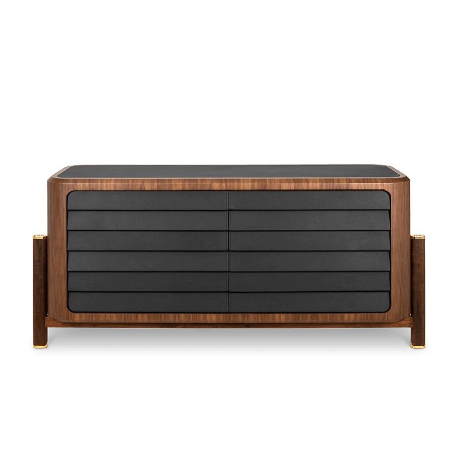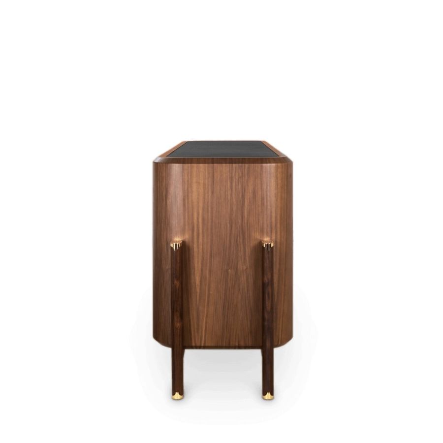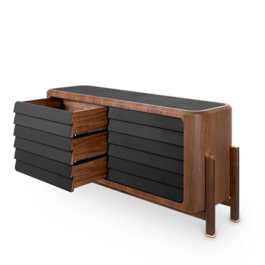 Introducing the Brando Sideboard, a discreetly stylish and modern storage solution. Its solid wood structure and dark fabric lend a sober and elegant appeal. Metallic details with the brand's logo enhance its uniqueness. A perfect blend of mid-century and modern design, making it an iconic piece for your luxury living room decor.