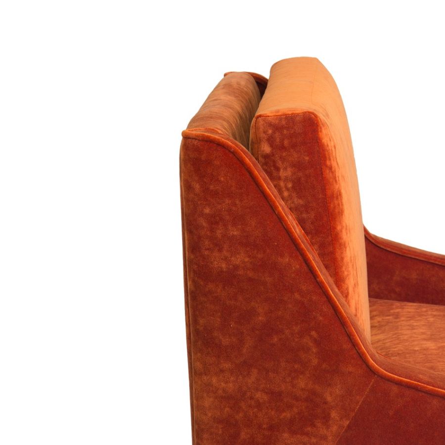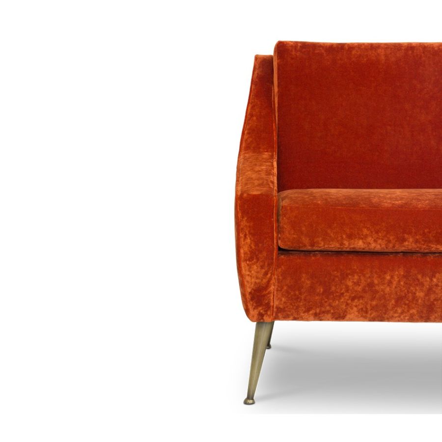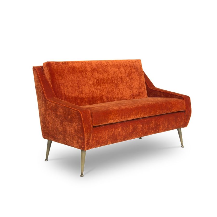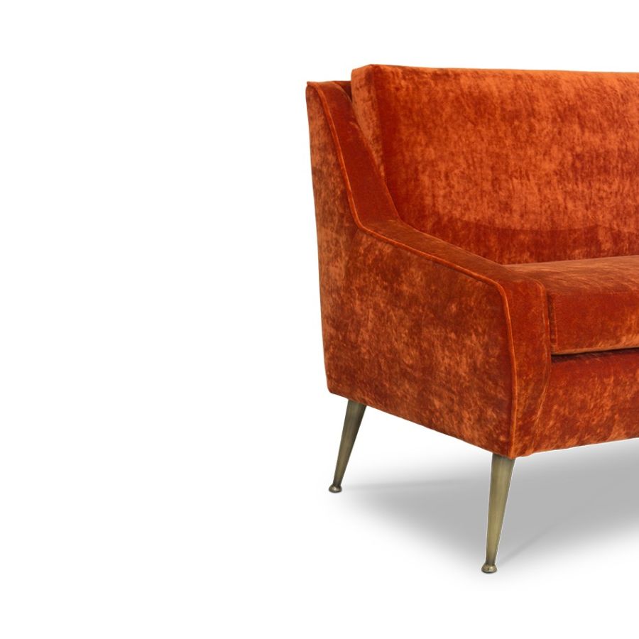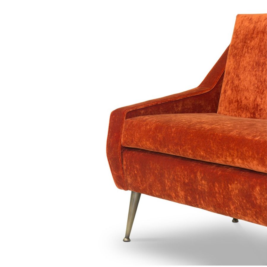 A contemporary mid-century modern style sofa featuring strong shapes and hard edges along with rich luxurious fabric. The legs are tapered and made of metal, with small round leg caps, providing a full contrast of shapes. The back has a degree reclining, so it can be used both as a living room sofa or as a lounge sofa for a chic bar.