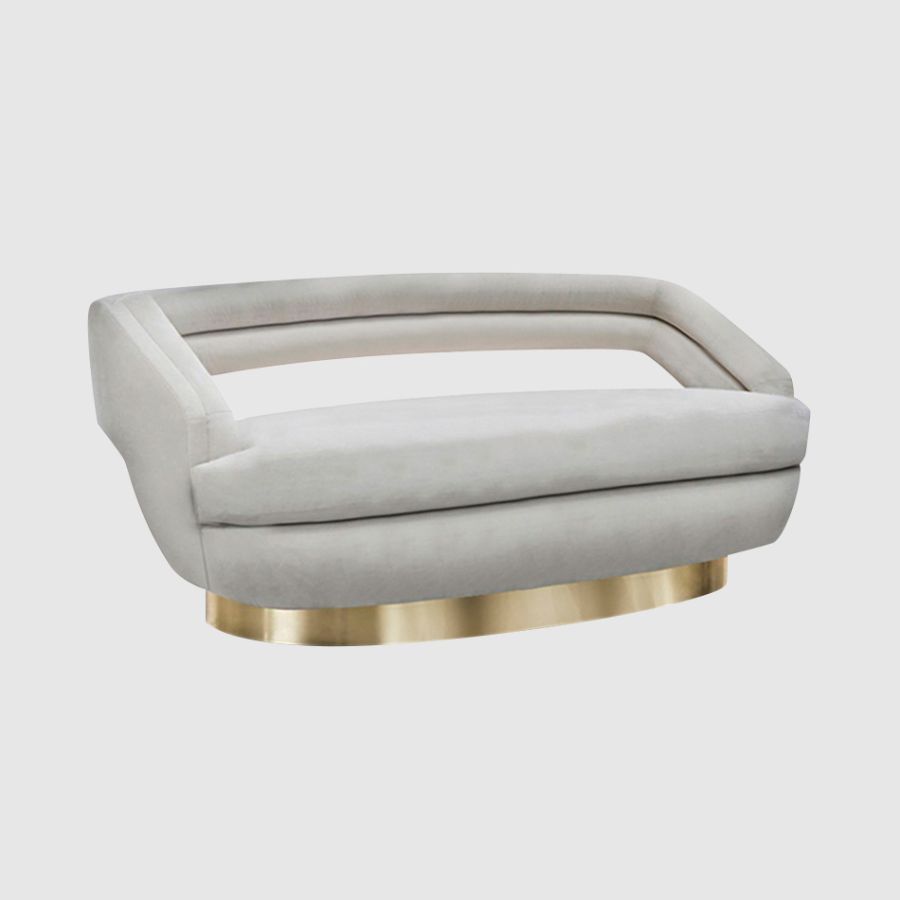 Like the other pieces from the Russel collection, this futuristic sofa is designed with edgy lines. It has a stylistic open back and sloping armrests that merge with the luxurious velvet upholstery. This unique design is then supported by a polished brass base that gives it even more of a mid-century modern look.