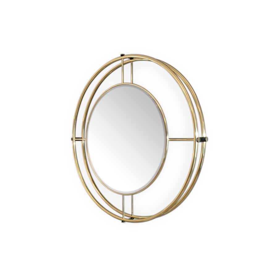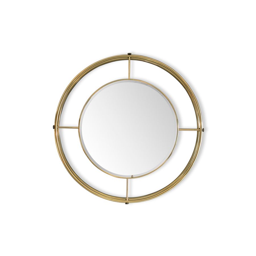 A beautiful piece of circular geometry. This large circular mirror is a structure made out of curved metallic tubes, that sustain a large circular mirror in the middle, which feels very organic and almost naval-like, creating a stunning and dynamic design. Shirley Mirror can easily be customizable to fit any client's type of project.