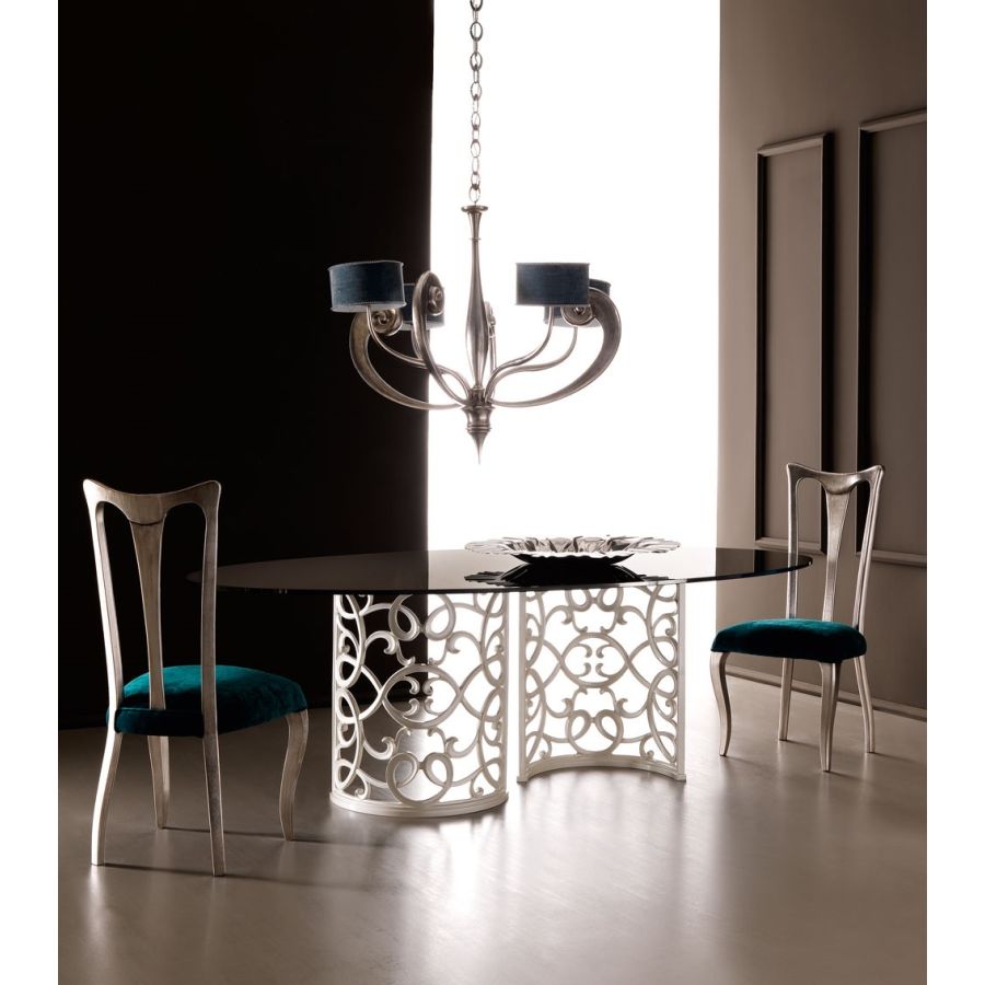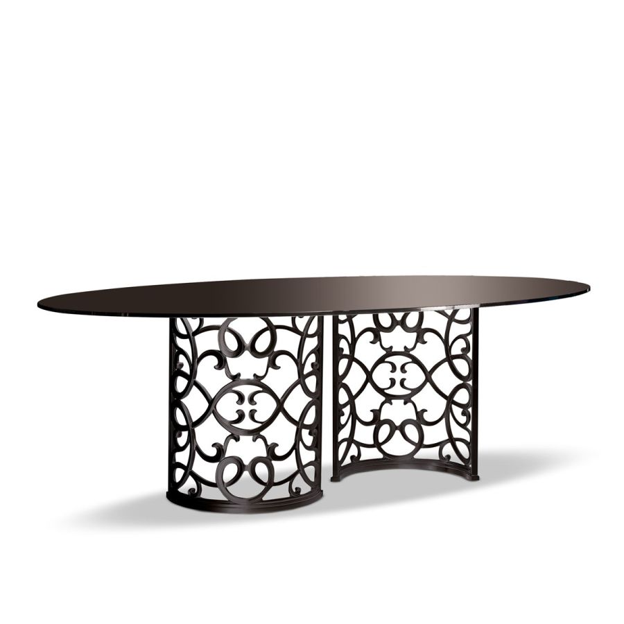 The original shape and luxury design of Flora table support was born by a poetic idea of the designer, inspired by the romantic dream of young girls composing an herbarium. The grace and charm of nature, made of leaves, stems and flowers is expressed by the decorative and ornate aluminium cast pedestals. The two statement half, available in a large palette of finishes can be assembled in a variety of configurations, depending on the dimension of the table top. The table top is available in glass, marble, wood or mirror to accomodate every design request.